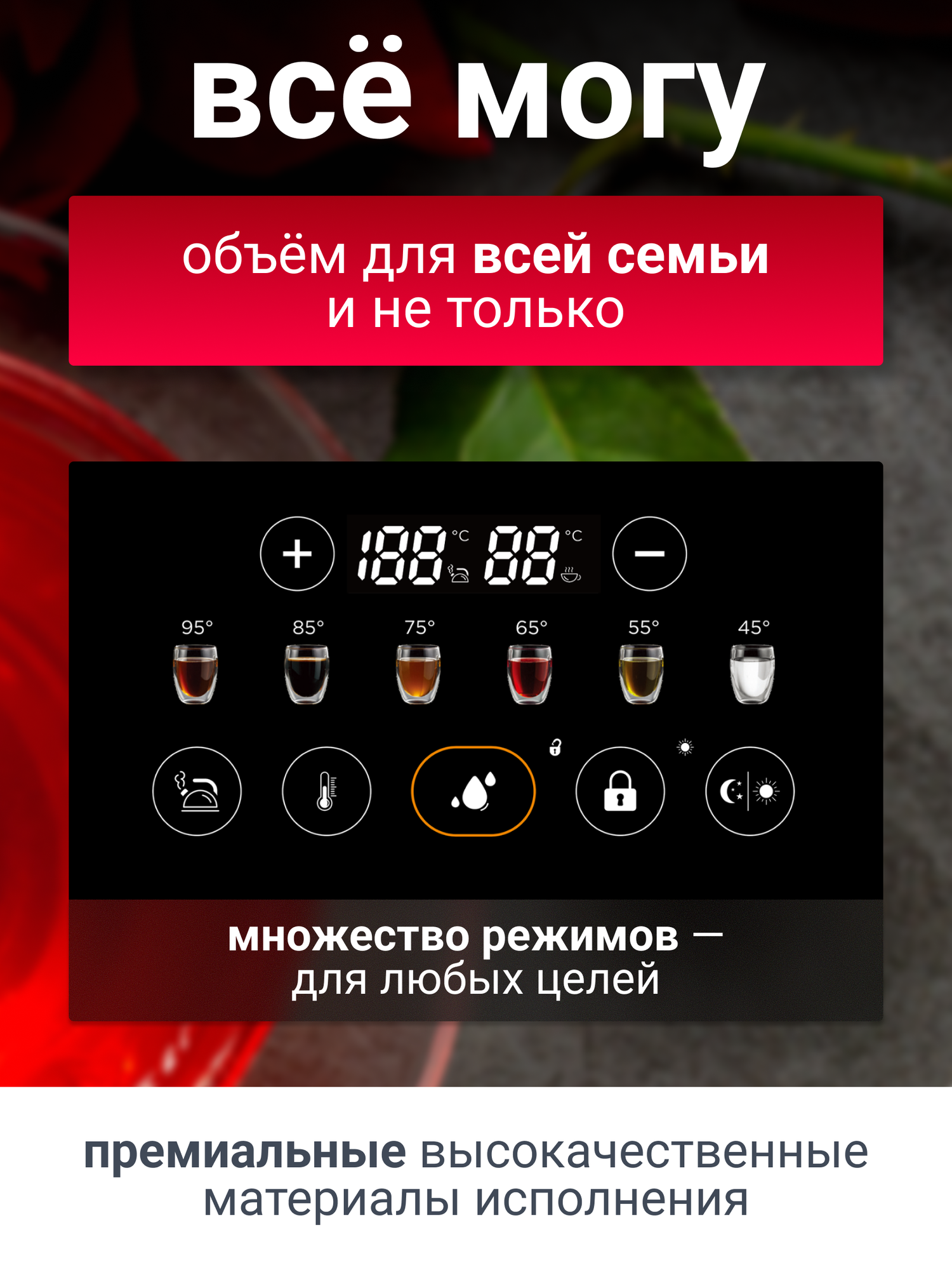 | Особенности | бесшумное закипание, двойные стенки, дисплей, индикатор уровня воды, индикация включения, сенсорное управление, съемная крышка, фильтр |