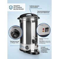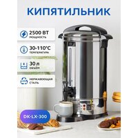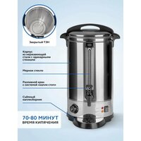 Большой электрический кипятильник термопот Gastrorag DK-LX-300 – это техника для профессиональной и домашней кухни, многофункциональный электро прибор, который совмещает функции кулера, чайника и термоса. Он предназначен для быстрого нагрева воды и поддержания ее температуры в течение длительного времени. Электрокипятильник заливного типа не требует подключения к водопроводу и обеспечит вас горячей водой повсюду, где есть электрические розетки 220 В. Настольный кипятильник-термопот объемом 30 л оптимален для линий раздачи предприятий общественного питания: ресторанов, кафе, столовых, закусочных. Он также идеально подойдет для приготовления горячих напитков в барах и оснащения детских садиков, школ, офисов и больниц. А в доме большой семьи он с успехом заменит бытовой электрический термочайник. На вашей кухне всегда будет запас горячей воды для приготовления блюд, напитков, детского питания. Мощность ТЭНа составляет 2500 Вт, время кипячения - 70-80 минут в зависимости от начальной температуры воды. После закипания воды в целях экономии электроэнергии термопот автоматически переходит в режим подогрева, периодически включается и выключается для поддержания температуры. Наливной кипятильник для воды Gastrorag имеет прочный корпус из нержавеющей стали и черного пластика с двумя удобными термоизолированными ручками для переноски. Стенки корпуса одинарные. Съемная крышка имеет фиксаторы для безопасного использования. Кипятильник оснащен регулятором температуры и защитой от сухого включения. Регулировка температуры осуществляется в пределах от 30 до 110оС. В положении 110оС кипение воды будет непрерывным. Закрытый ТЭН не соприкасается с питьевой водой, что упрощает процедуру ухода и очистки от накипи. Уровень воды в баке легко визуально контролировать благодаря мерному стеклу. Розлив воды осуществляется через пластмассовый кран с системой "капля стоп".