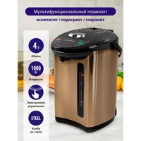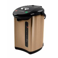 Термопот электрический, кипячение - 1000 Вт, подогрев - 30 Вт, емкость 5Л, 304 сталь, автоматическая подача воды/электро-насос/ручной насос, кипячение/автоподогрев/повторное кипячение, автоотключение при недостатке воды, LED-индикация, защита от перегрева Компактный термопот емкостью 5 литров с удобной панелью управления и функцией поддержания температуры. Три режима работы – автокипячение, поддержание температуры и режим повторного кипячения позволяют использовать термопот с наименьшими энергозатратами, при этом горячая вода или кипяток - всегда под рукой. Благодаря корпусу из нержавеющей стали и закрытому нагревательному элементу термопот обладает значительной прочностью и экологически чист - нержавеющая сталь не имеет запаха и сохраняет природные натуральные свойства воды. Плоское дно чайник термопот с закрытым нагревательным элементом очень функционально – легко моется и противостоит накипи, не ржавеет и не корродирует, а значит обеспечивает термопоту максимально долгий срок службы. Блокировка помпы ручного насоса управления и многоуровневая защита обеспечивает полную безопасность использования термопота.