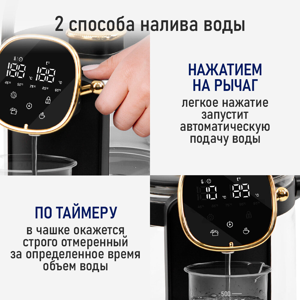 Три режима работы – кипячение, поддержание температуры и режим повторного кипячения позволяют использовать термопот с наименьшими энергозатратами, при этом горячая вода или кипяток - всегда под рукой.