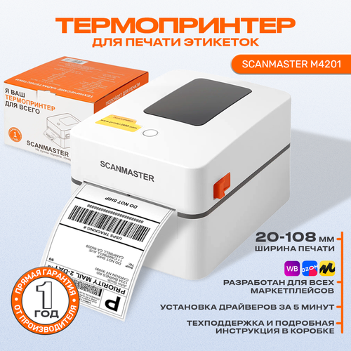 Термопринтер SCANMASTER SM4201 — настольный термопринтер со скоростью печати 152 мм/сек и разрешением 203 dpi. Гарантия от производителя 1 год. Отличный вариант для предприятий любого масштаба и селлеров на маркетплейсах - принтер обладает оптимальными свойствами для быстрой печати этикеток. Отличается демократичной стоимостью, компактными габаритами 232х180х152 и поддержкой печати на различных материалах: непрерывной ленте, этикетках с зазорами, черной меткой и перфорацией. Также подойдет для печати наклеек.