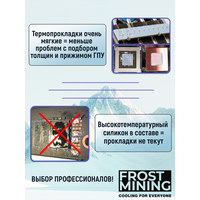 Термопрокладки FrostMining Extremal Termal Pads 15 Вт/мК – самые популярные высокопроизводительные термопрокладки в нашей линейке! Это отличный выбор для вашей техники! Предназначены для отвода тепла от нагревающихся элементов оборудования и бэкплейтов средне и высокопроизводительного оборудования и видеокарт. Если вы хотите обслужить производительную и горячую видеокарту для "тяжелых" игр и мощного разгона - данное решение как раз для вас! Наши термопрокладки позволят устранить перегрев вашей техники. Преимущества наших термопрокладок: Высокое качество материалов Теплопроводность 15 Вт/мК, идеально подходят для любого оборудования Выпускаются во всех необходимых для обслуживания толщинах Не текут Не проводят электрический ток Наши термопрокладки подходят для множества интерфейсов, отводом тепла на которых являются радиаторы, таких как: видеокарты, NVMe накопители, материнские платы, оперативная память и других электронных устройств, где конструктивно предусмотрено использование термопрокладок. Все термоинтерфейсы FrostMining изготовлены из передовых материалов с учетом пожеланий геймеров и любителей разгона. Термопрокладки от FrostMining - это идеальное решение для охлаждения вашего оборудования! Инструкция по применению: 1) Очистите вашу систему охлаждения от пыли и грязи; 2) Удалите пленку с обеих сторон термопрокладки 3) Вырежьте скальпелем или канцелярским ножом нужный размер термопрокладки; 4) Разместите термопрокладки на греющихся элементах вашего оборудования; 5) Закрутите систему охлаждения.