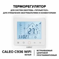 Терморегулятор CALEO C936 Wi-Fi — встраиваемый цифровой программируемый регулятор температуры с возможностью удаленного управления по Wi-Fi при помощи мобильного приложения. Предназначен для управления электрическими и водяными системами обогрева: всеми видами теплых полов, различными электронагревателями и конвекторами, шаровыми кранами с электродвигателем, электромеханическими, электромагнитными и тепловыми клапанами.