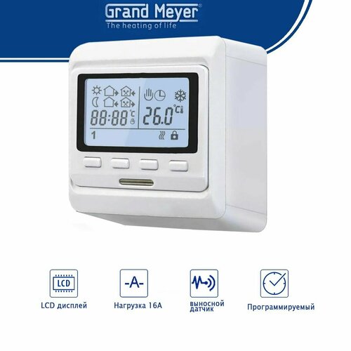 - Grand Meyer HW500 – кнопочный программируемый терморегулятор для управления теплым полом. Возможность программируемого и ручного управления. Возможность установки недельного периода 5+2/6+1/7 дней. Память настроек при отключении питания. Встроенный воздушный датчик и выносной датчик длиной 3м. Регулятор предназначен для скрытого (утопленного) монтажа в гнезде с монтажной коробки. Диапазон установки: от +5С до +35С (заводские). Рабочее напряжение 220-240 В~ 50/60 Гц. Нагрузка 16А/3600 Вт. Выносной датчик пола: NTC датчик. Встроенный датчик воздуха: Да. Пределы регулирования: +5С ~ +99С (заводская +5С ~ +35С). Рабочая температура: -5С ~ +50С. Программирование: Да. Недельный 5+2/6+1/7 дней. Защита от замерзания: Да. +5С Материал корпуса: Самозатухающий ПВХ. Цвет пластика: Белый или Бежевый. Класс защиты: IP20. Размеры в сборе: 86х86х56мм. Размеры внешние: 86х86х13мм. Сертифицирован: CE, EAC. Продукция сертифицирована, гарантийный срок - 12 месяцев.