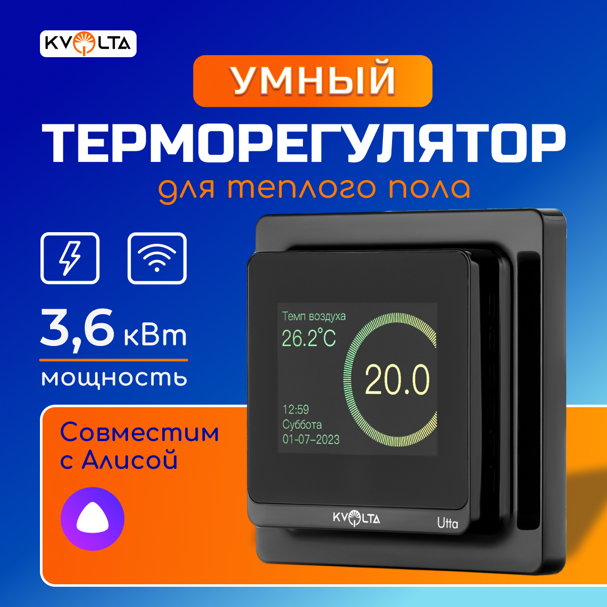 Терморегулятор Kvolta Utta Wi Fi работает с электрическим, инфракрасным и водяным теплым полом, а также совместим с системой "Умный дом" и экосистемой Tuya Smart.