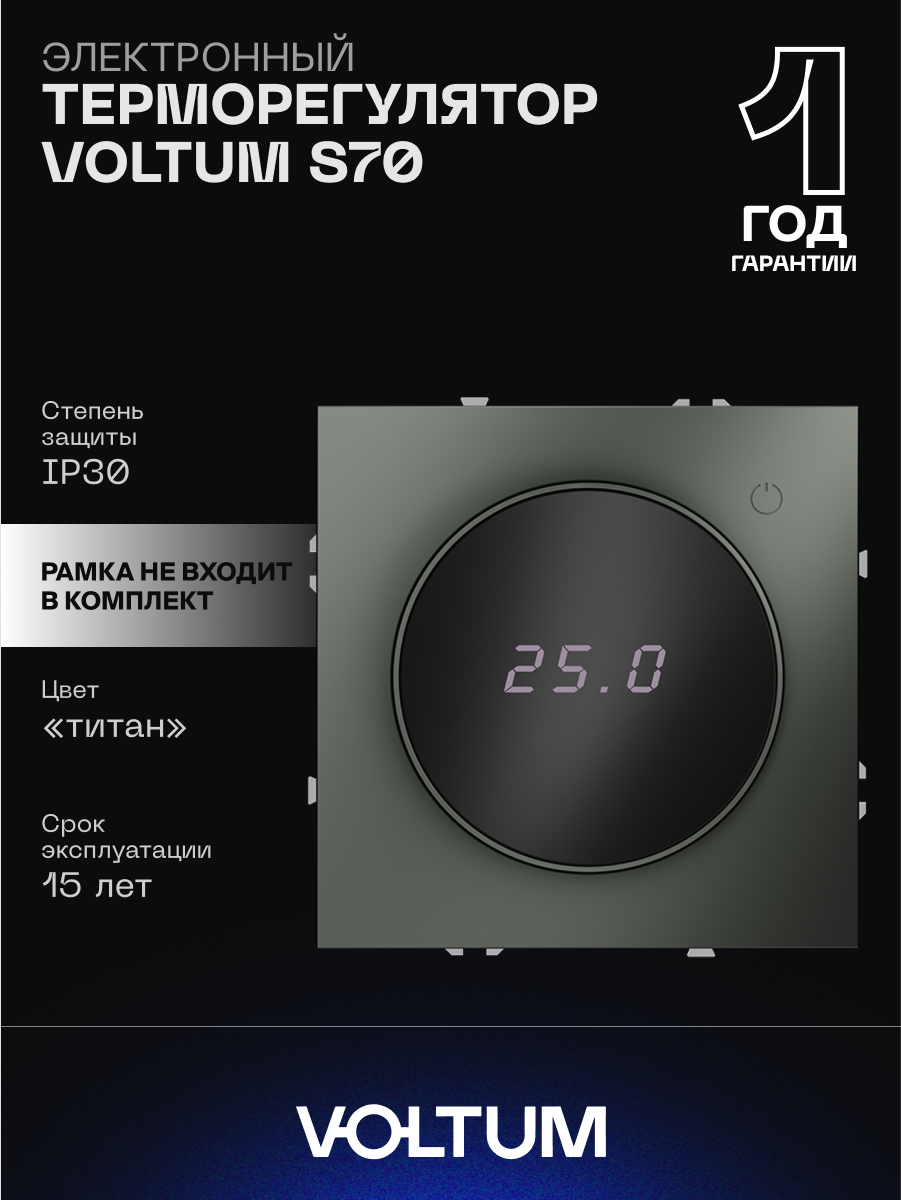 Электронный терморегулятор VOLTUM S70 для теплого пола Умное управление температурой с индикацией и энергосберегающим режимом Точный контроль температуры – встроенный датчик и цифровой дисплей для комфортного нагрева пола Наглядная индикация – светодиодный индикатор показывает режим работы (нагрев/отключение) Энергосберегающий режим – автоматическое снижение яркости дисплея через 15 минут бездействия Универсальное подключение – работает с любыми типами теплых полов (до 3500 Вт) Простое управление – регулировка температуры поворотной ручкой Совместимость с рамками VOLTUM S70 – стильный дизайн в едином стиле электрофурнитуры Комплектация: ✔ Терморегулятор с механизмом ✔ Датчик температуры пола ✔ Пластиковая накладка VOLTUM S70 – комфортный климат и smart-управление в вашем доме!