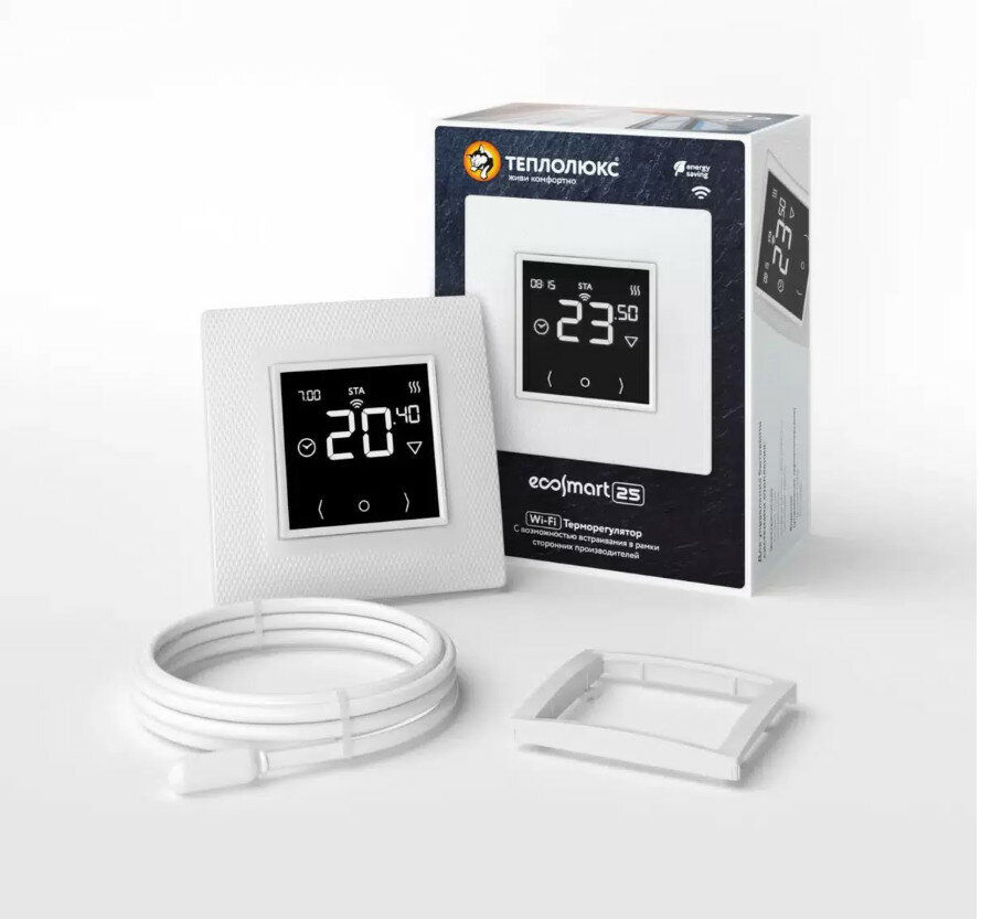 "Теплолюкс" EcoSmart 25 - программируемый сенсорный терморегулятор на Wi-Fi предназначен для управления бытовыми электрическими и водяными* системами отопления – теплые полы, конвекторы, полотенцесушители, бойлеры и др.