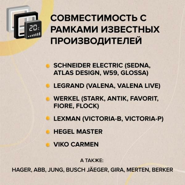 Благодаря оригинальному решению по соединению двух частей терморегулятора его можно использовать совместно с рамками электроустановочных изделий многих известных брендов (Schneider Electric, Legrand, Werkel, ABB, Lexman, Viko, Hegel, Gira, Hager, Jung, Berger, Merten и других).