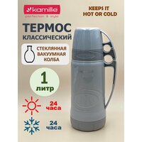 Купить Термос 1 л. со стеклянной колбой Kamille KM 2031 пластиковый, 2 чашки (2031 / серый) с доставкой по всей России.