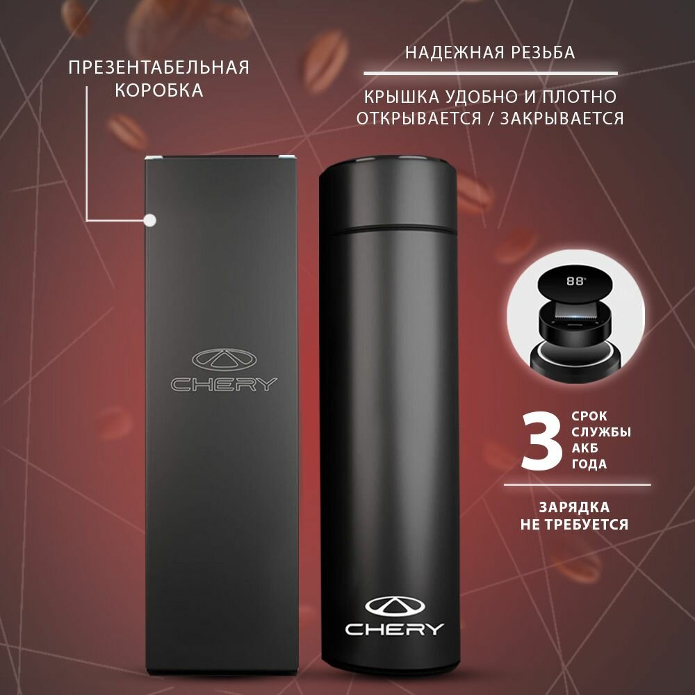 Умный термос с логотипом авто Chery и светодиодным LED дисплеем, отображающим температуру, сделан из нержавеющей стали медицинского уровня с противоударными свойствами. На герметичной крышке термоса есть специальное, уплотнительное кольцо, которое создаёт хороший вакуум и долго держит тепло. Особое силиконовое покрытие на внешнем донышке делает термос устойчивым на любой поверхности. Термос рассчитан на 3 года автономной работы без дополнительной зарядки акб. На внутренней стороне крышки находится чувствительный датчик температуры. Так же в термосе предусмотрена сетка для фильтрации чая и других напитков. Внешнее покрытие термоса из приятного на ощупь полипропилена. Внешний, светодиодный дисплей отображает температуру одним касанием. Температура внутри термоса сохраняется до 12 часов. Кружка термос легко открывается и герметично закрывается, дополнительный механизм в виде клапана- пробки позволит быстро налить напиток и не расплескать. Такой термос подходит как для горячих напитков, так и для холодных. Вакуумные двойные стенки термоса сохраняют нужную температуру даже в долгих поездках, он компактный, лёгкий и не займет много места. Термос с логотипом марки авто упакован в стильную коробку и станет отличным подарком.