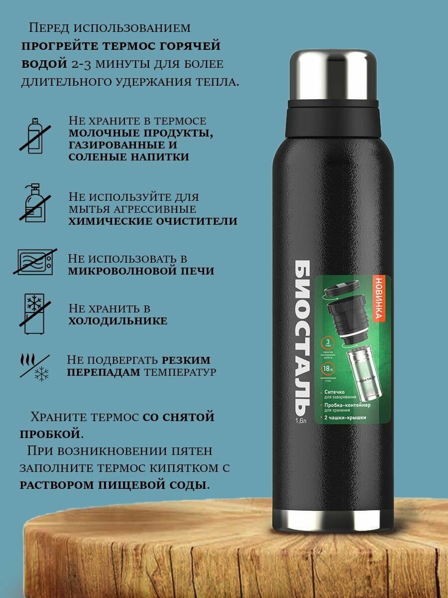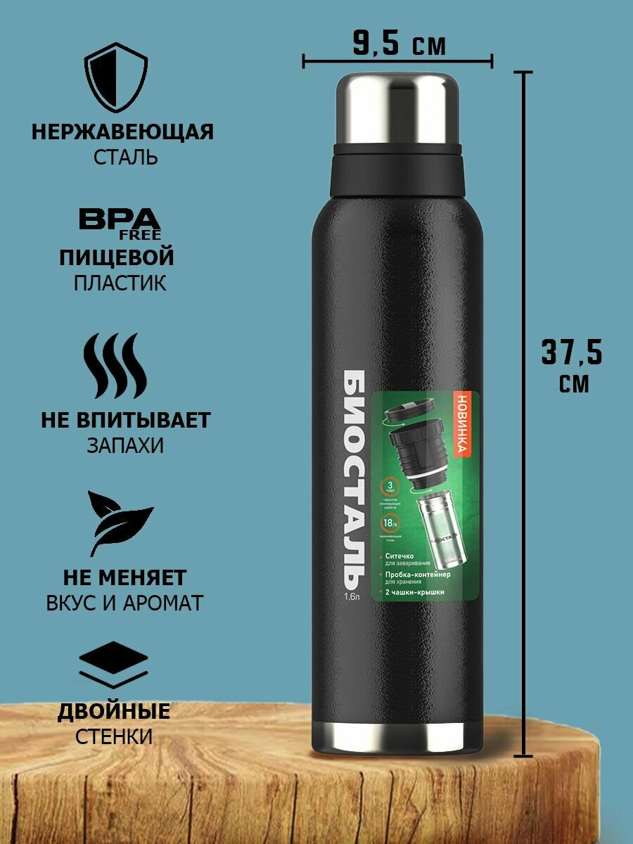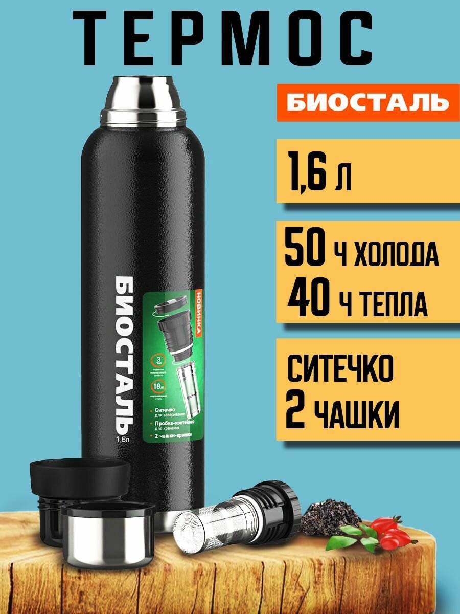 Термос Биосталь Biostal для чая и кофе, 1,6 литра, 2 чашки, с ситечком, черный, NBR-1600Z-C: сравнение цен, характеристики, фото, актуальное наличие и цены.