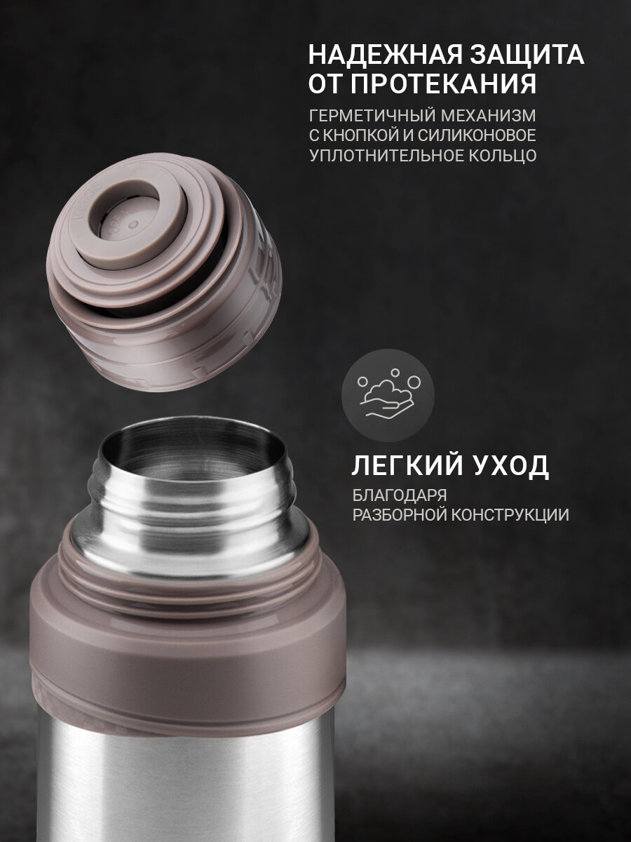 Колба термоса изготовлена из высококачественной нержавеющей стали марки 18/10 (AISI 304). Матовая полировка. Винтовая пробка, кнопочный механизм, узкое горлышко. Завинчивающаяся крышка-кружка. Термос снабжен удобной компактной ручкой и ремешком для переноски. Цвет пластиковых элементов (PP) - светло-коричневый. Двойные стенки и находящийся между ними вакуум минимизирует темплообмен, а внутренние стенки термоса отражают температуру содержимого. Вакуумная конструкция термоса предотвращает нагревание внешней стенки термоса, даже если он наполнен кипятком. Внутренняя кнопочная крышка гигиенична и герметична, а также минимизирует потери тепла и охлаждение напитка. При завинчивании внешней крышки клапан автоматически закрывается. Сохранение температуры: 6 часов - 83⁰C, 12 часов - 74⁰C, 24 часа - 61⁰C. Для лучшего сохранения температуры прогрейте термос кипятком. Рекомендуется ручная мойка.