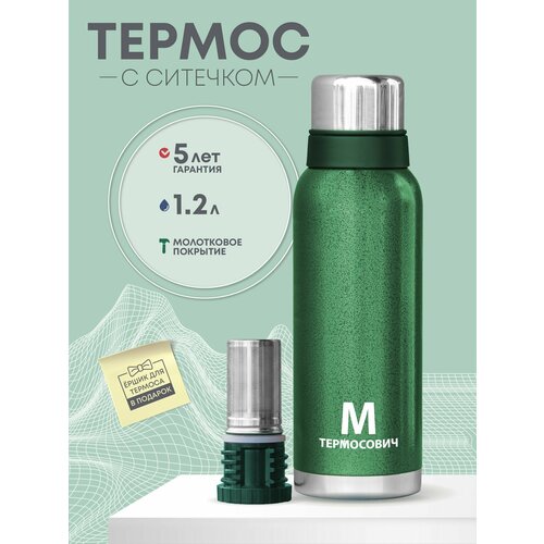 Термос для чая 1,2 л с ситечком, в котором удобно заваривать не только мелко листовой чай, но и полезные для здоровья травяные сборы. При этом заварник съёмный: его удобно наполнять, мыть. В комплекте с термосом входят две чашки. Из-за дополнительной медной изоляции термос с ситечком имеет улучшенные показатели удержания тепла 32 часа, так что подойдет для дальнего путешествия, для отдыха на природе, для рыбалки, для охоты, для туризма. Благодаря оптимальной конструкции крышка термоса плотно прилегает к горлышку, обеспечивая 100% герметичности. Премиальное качество и стильный дизайн - полезный подарок универсальный для каждого. Данный термос удачное решение для подарка на любой праздник для родных и близких. Термос маленький это удобный и отличный способ сохранить тепло вашего чая или кофе, который идеально подходит для занятых людей, проводящих свое время вдали от дома. Он вмещает в себя 1200 миллилитров воды. Термос изготовлен из высококачественной нержавеющей стали, которая не впитывает запахи и обеспечивает длительный срок службы. Это делает его отличным выбором для охотников, рыболовов и всех, кто любит активный отдых на природе. Термосович также подходит для детского питания, так как его конструкция гарантирует 100% герметичность, и его можно использовать в качестве термоса для воды или кофе. Кроме того, он оснащен складной ручкой и съемным ремешком для удобной переноски. Термос покрыт специальной молотковой эмалью, что позволяет усилить его износостойкость. Пробку не нужно полностью выкручивать, чтобы налить чай, кофе достаточно 1-2 оборота. Её легко мыть, она лучше удерживает температуру, чем термос с кнопкой.