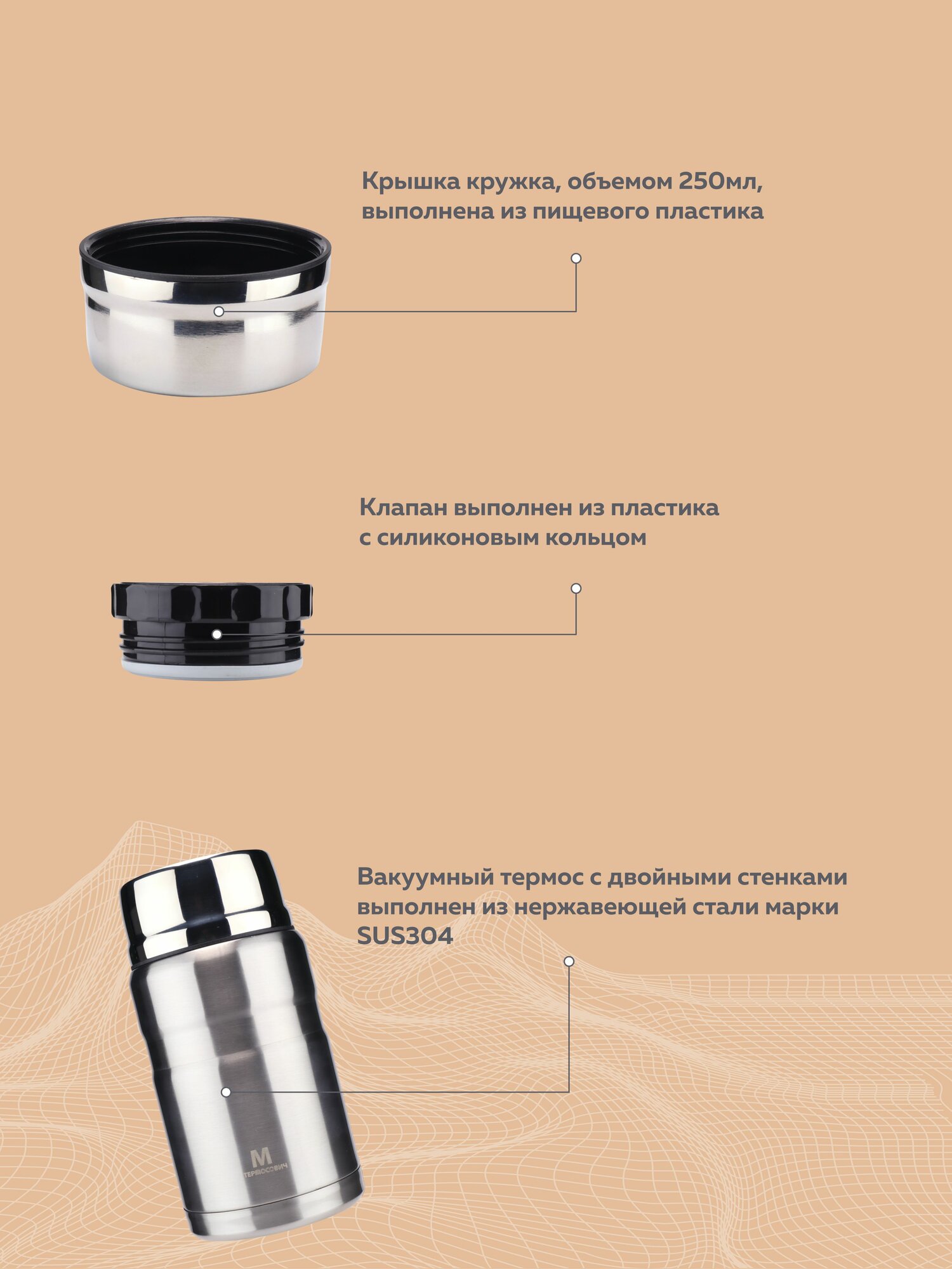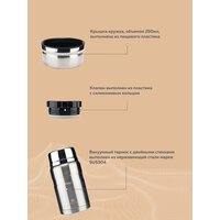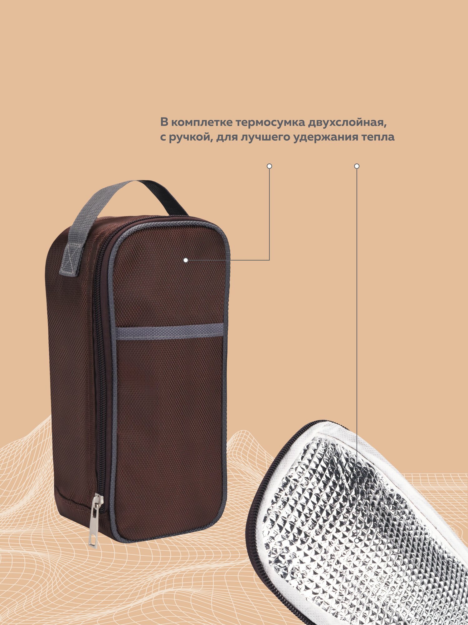 Практичный термос для еды станет надежным спутником в походах, на отдыхе на природе или в повседневной жизни. Выполненный из высококачественной нержавеющей стали, он обеспечивает долговечность и сохранение температуры ваших блюд и напитков. Дизайн и конструкция:- Корпус из матовой нержавеющей стали с гладкой текстурой устойчив к повреждениям и легко чистится.- Широкое горло позволяет удобно наполнять термос супами, кашами или другими блюдами.- Герметичная крышка-чашка обеспечивает комфортное употребление пищи в любых условиях.- В комплект входит складная ложка — идеальное решение для удобства в путешествии. Дополнительные преимущества:- В комплект включена термосумка для удобной транспортировки. Она выполнена из прочного материала, который сохраняет тепло содержимого даже при длительном использовании.- Ершик для чистки колбы идет в подарок, облегчая уход за изделием.- Колба выполнена из качественной нержавеющей стали, которая поддерживает тепло до нескольких часов, сохраняя свежесть продуктов. Функциональность: Термос идеально подходит как для горячих супов и чая, так и для холодных напитков или десертов. Прочная пробка гарантирует герметичность, что особенно важно при активном туризме и походах. Гарантия качества: На изделие распространяется гарантия 5 лет — это подтверждение его надежности и долговечности. Этот универсальный аксессуар станет незаменимым помощником как в походах, так и в ежедневных делах. Благодаря компактным размерам и эргономичному дизайну его легко брать с собой куда угодно.