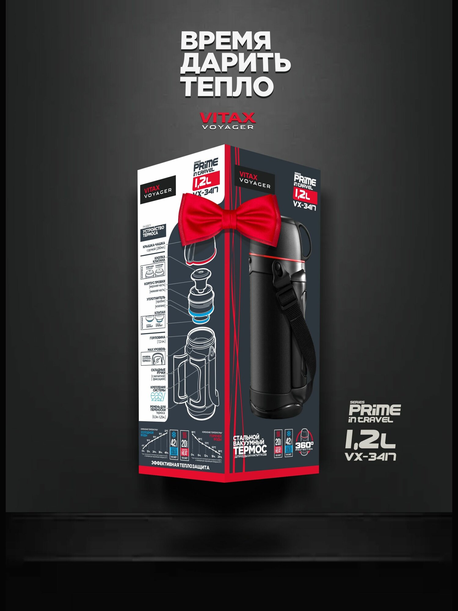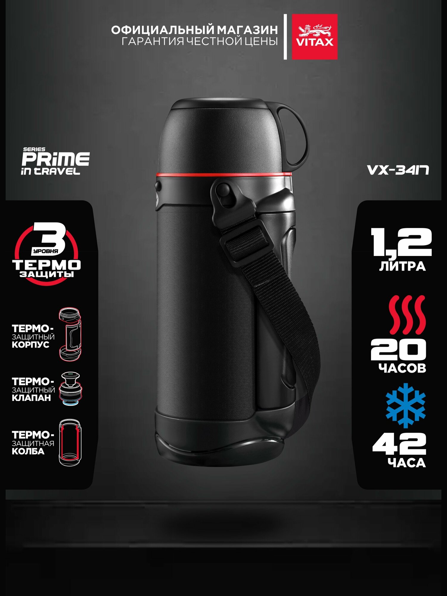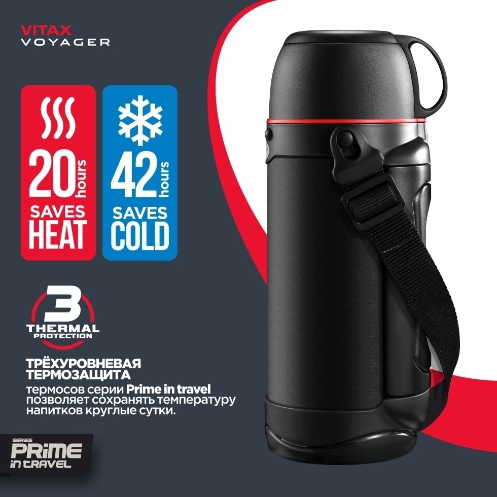 Термос VITAX Prime in travel 1,2л c ручкой, 2-мя крышками-чашками нерж. сталь, пластик