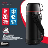 Большой термос серии Prime in travel объемом 1 литр 200 мл-универсальный термос с широкой горловиной (7,2 см) создан для сохранения температуры еды, чая, кофе, трав и других напитков. Внутренняя колба изготовлена из высококачественной нержавеющей стали марки SS30408. Прочный противоударный корпус термоса, выполнен из пищевого термостойкого пластика.