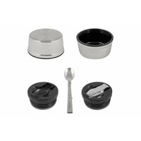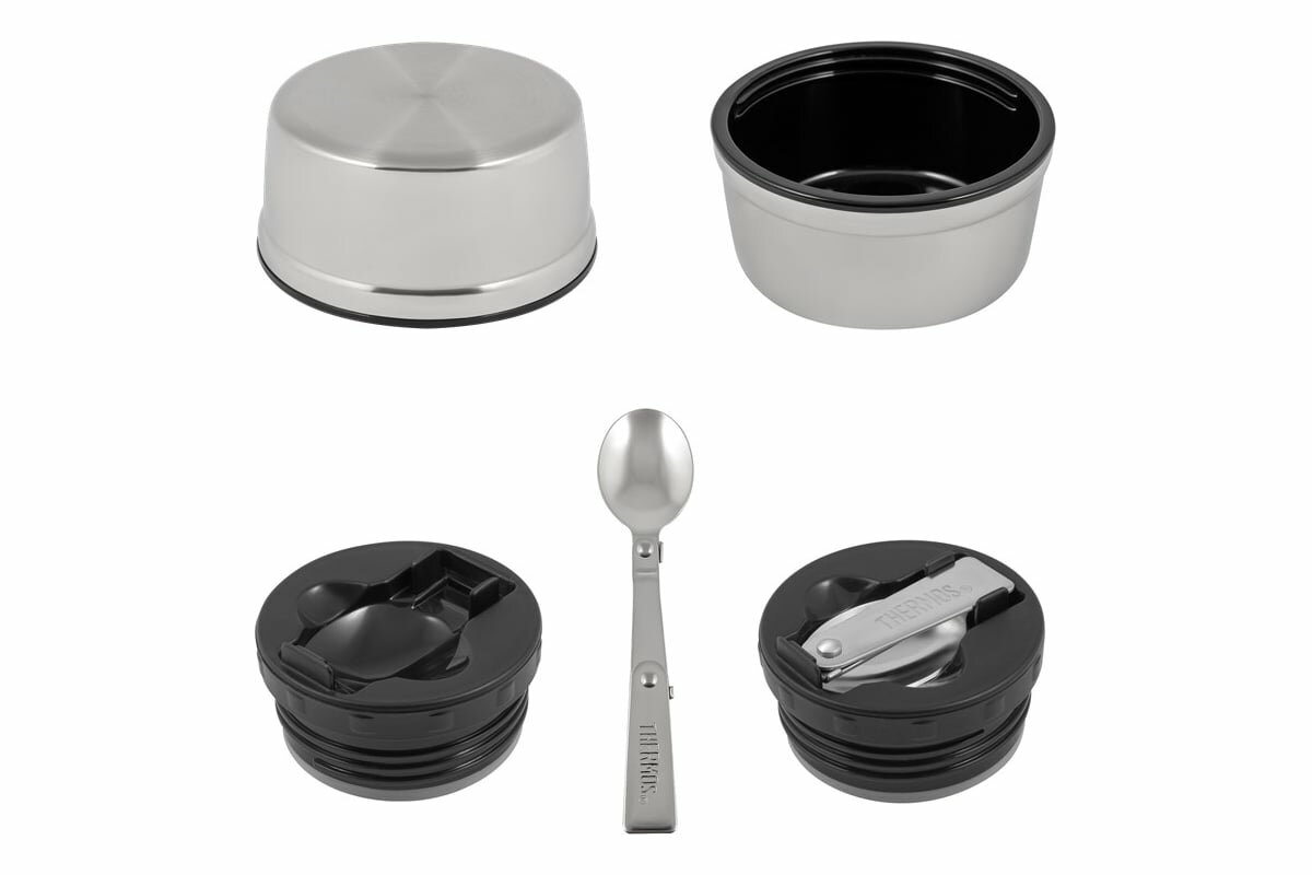 Широкое горло, полноразмерная крышка-чашка и металлическая складная ложка позволяют использовать термос для первых или вторых блюд. Объём термоса рассчитан на 1-2 приёма пищи.
