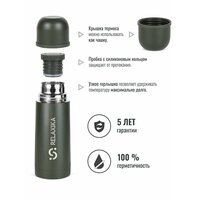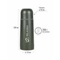 Классический термос Relaxika с высокими показателями удержания температуры напитка для походов, путешествий, спорта и ежедневного использования. Прочные двойные стенки из высококачественной нержавеющей стали 18/8 с вакуумной изоляцией гарантируют, что ваш напиток останется холодным в течение 22 часов и горячим до 16 часов. Этот материал не только прочен, но и гигиеничен, не выделяет никаких вредных для здоровья веществ. Ваши напитки сохраняет естественный вкус и не приобретут посторонний запах.