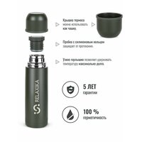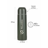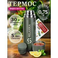 Классический термос Relaxika с высокими показателями удержания температуры напитка для походов, путешествий, спорта и ежедневного использования. Прочные двойные стенки из высококачественной нержавеющей стали 18/8 с вакуумной изоляцией гарантируют, что ваш напиток останется холодным в течение 30 часов и горячим до 36 часов. Этот материал не только прочен, но и гигиеничен, не выделяет никаких вредных для здоровья веществ. Ваши напитки сохраняет естественный вкус и не приобретут посторонний запах.