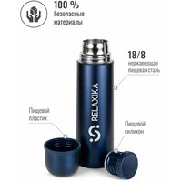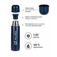 Классический термос Relaxika с высокими показателями удержания температуры напитка для походов, путешествий, спорта и ежедневного использования. Прочные двойные стенки из высококачественной нержавеющей стали 18/8 с вакуумной изоляцией гарантируют, что ваш напиток останется холодным в течение 28 часов и горячим до 22 часов. Этот материал не только прочен, но и гигиеничен, не выделяет никаких вредных для здоровья веществ. Ваши напитки сохраняет естественный вкус и не приобретут посторонний запах.