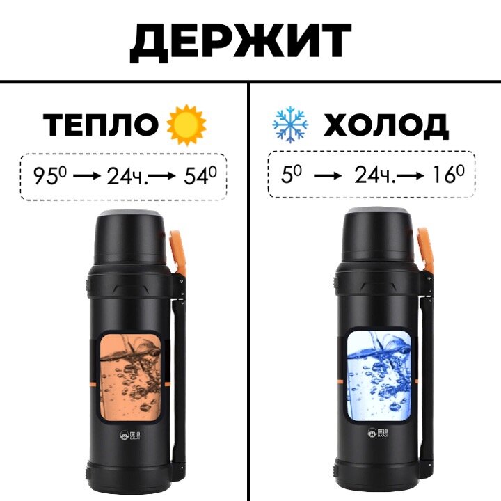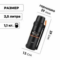 Вместительный термос с удобной складной ручкой и дополнительной ручкой для удобства наливания. Размеры: 39х13 см Вес: 1100 грамм Объем 2,5 л Внутренний диаметр горлышка: 59мм Температура кипятка (95°) через 24ч: 54° Температура холодной воды (5°) через 24ч: 16° Корпус и внутренняя колба - из нержавеющей стали 304SS Матовое порошковое покрытие Две чашки в комплекте. Верхняя чашка снаружи сделана из нержавеющей стали. Складываемая вертикальная анатомическая ручка Вторая горизонтальная ручка для переноски или более уверенного наливания жидкости с двух рук. Для больших термосов это бывает актуально. Противоскользящее дно Полуавтоматическая быстрооткрываемая крышка нового поколения с встроенным ситечком для отделения заварки. Картонная упаковка: 39х13,5х13,5 см