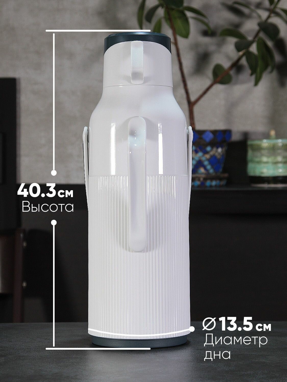 Термочайник с двумя ручками (встроенной в корпус и откидной) для удобства переноски и использования. Чайник заварочный надежно держать в руке при выливании напитка (это особенно важно для пожилых людей и людей с ограниченными возможностями).