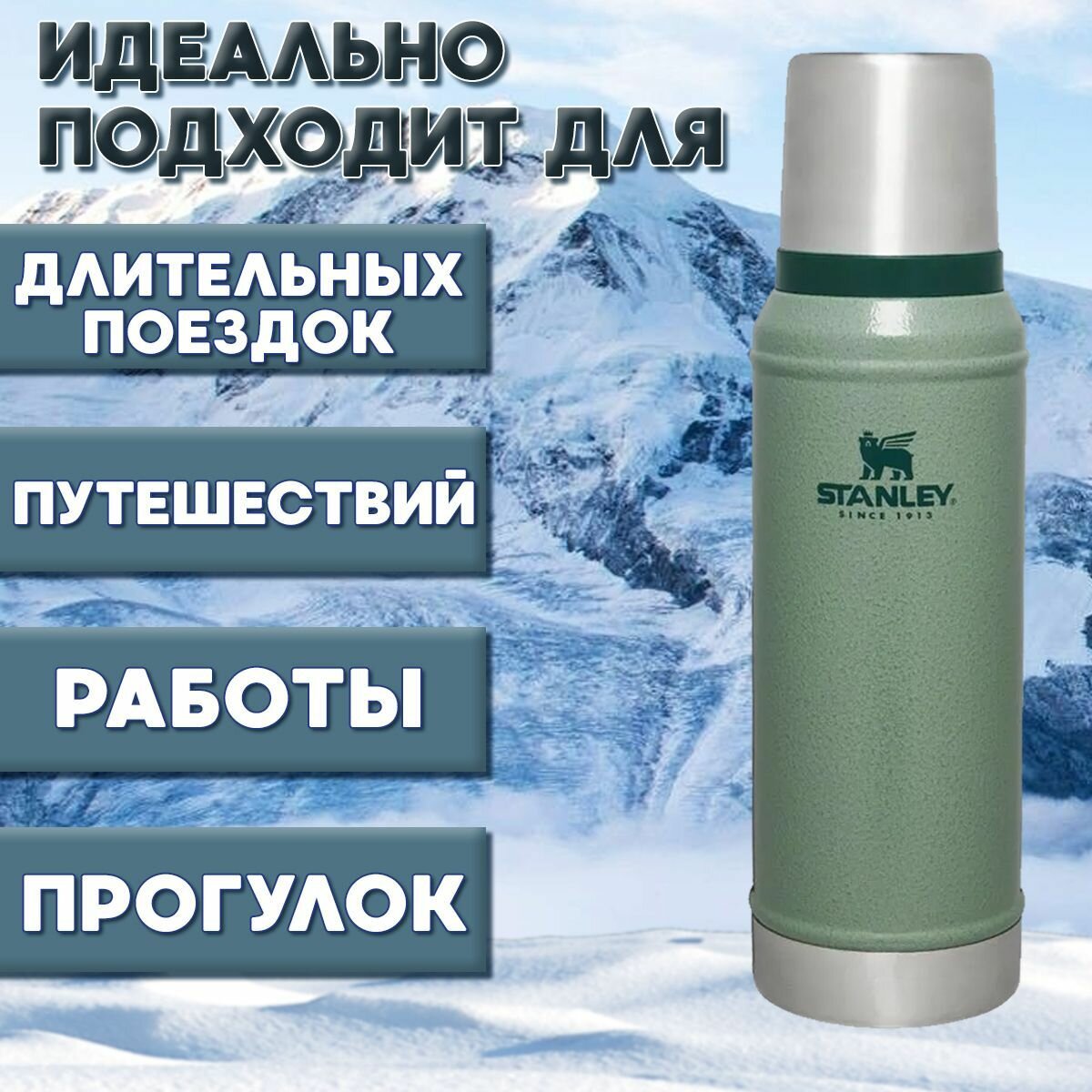Термос STANLEY CLASSIC в стильном темно-зеленом исполнении — это идеальный выбор для активных людей, ищущих компактный и надежный термос на каждый день и в путешествия. С объемом 0,75 литра, он легко разместится в вашей сумке или рюкзаке, став незаменимым спутником для поездок на природу, деловых встреч или просто для использования дома или в офисе. Изготовленный из высококачественной нержавеющей стали 18-8, этот термос Stanley отличается высокой прочностью и долговечностью. Его внешний корпус идеально справляется с механическими воздействиями и не боится ударов, что особенно важно для тех, кто ведет активный образ жизни. Оба слоя термоса оснащены вакуумной изоляцией с двойными стенками, благодаря чему он эффективно удерживает тепло до 20 часов, а холод — до 20 часов. Если к напитку добавить лед, охлаждение сохранится на удивительные 96 часов. Одной из ключевых особенностей термоса стенли является изотермическая крышка с тремя положениями фиксации, что обеспечивает удобство использования. Также важно отметить, что в термос встроена складная многоразовая пластиковая трубочка для питья, позволяющая легко наслаждаться напитками прямо из термоса. Ручка для переноски делает его еще более удобным и практичным, обеспечивая комфорт в транспортировке. Наружное покрытие из абразивостойкой эмали не только придает термосу стильный и современный вид, но и защищает его от царапин и других повреждений, сохраняя его презентабельный внешний вид. Кроме того, термос можно мыть в посудомоечной машине, что упрощает его обслуживание и уход за ним. С весом всего 640 граммов, термос STANLEY CLASSIC 0,75 L идеально подходит для длительных деловых и туристических поездок. Благодаря своим компактным размерам и легкому весу он станет надежным помощником в любых приключениях. Несомненно, этот термос — оригинал легендарного американского бренда. Выбирая термос stanley, вы приобретаете не только качественный и надежный прибор, но и стильный аксессуар, который подчеркнет вашу индивидуальность. Этот термос станет отличным выбором для любителей активного отдыха, обеспечивая отличный способ поддерживать температуру любимых напитков.