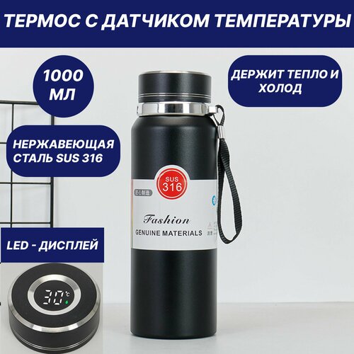 Стальной термос из нержавеющей стали 1 литр со встроенным термометром - то, что всегда пригодится в путешествии, на учебе, на прогулке или на тренировке. Туристическая посуда изготовлена из нержавеющей стали, которая не впитывает запахи. На крышке термоса размещен LED дисплей, показывающий температуру напитка. Он работает от батарейки CR 2032. Если батарейка сядет, ее всегда можно заменить. Походный термос подойдет для еды и напитков: чай, кофе, ягодный морс, компот, которые всегда будут под рукой. Посуда для кухни долговечна и устойчива к ударам. Внутри фляги размещено сито, предотвращающее попадание заварки и посторонних предметов в жидкость. Универсальный термос для чая экономит место в рюкзаке или сумке. Спортивный пищевой термос -кружка сохранит температуру 24 часа, а герметичная крышка не подтекает. Диаметр термоса подходит для большинства автомобильных подстаканников, поэтому наш термос можно использовать как автомобильный аксессуар - автокружку, размещаемую в подстаканнике. Стальной термос для горячих напитков - это интересный подарок папе, спортсмену, охотнику, рыбаку, любимому, мужу, брату, дедушке на день рождения, юбилей, праздник или просто так! Термопосуда для похода не рекомендуется для мытья в посудомоечной машине.