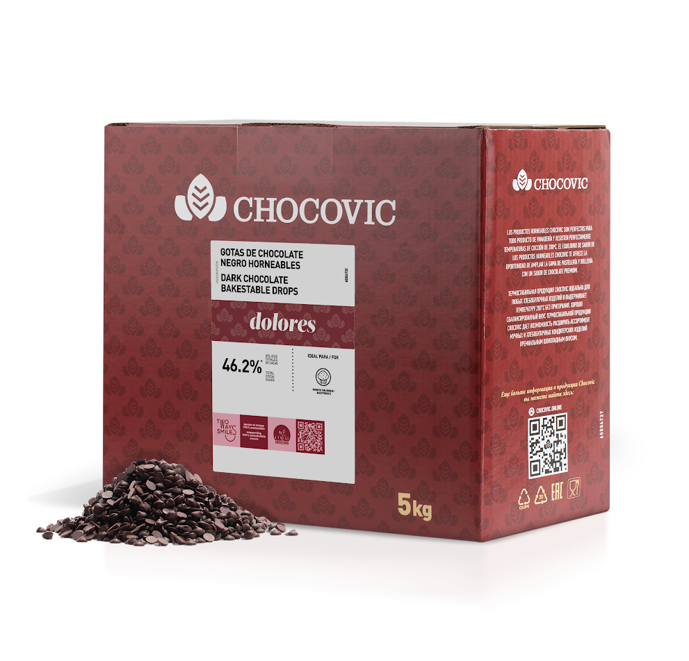 Термостойкие капли из темного шоколада 44,7%. Прекрасно подходят для декора различных десертов, тортов и мороженого, а также для использования в хлебе и булочках, круассанах, пирожных или печеньях. Термостабильная продукция Chocovic идеальна для любых хлебобулочных изделий и выдерживает температуру 200°C без пригорания.