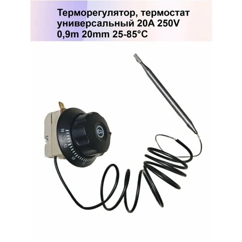 Капиллярный термостат с диапазоном регулирования 25-85 °С (аналог 55.13014.260) 20А 250V 0,9м 24мм с ручкой маховик. Регулируемый термостат универсальный предназначен для точного контроля температуры в водонагревателях, электрических котлах, мармитах ЭМК Абат , ЭМК-40, Шкаф расстоечный тепловой ШРТ, печи, духовок, пмэс кипятильников и т. п Термостат с капиллярной трубкой - стабильное и надежное устройство гарантирующее комфорт и безопасность в использовании вашего оборудования. Датчик изготовлен из термопластика и металла. Длина капиллярной трубки 90см напряжение 250V Термостат для водонагревателя - качественный и недорогой аналог Терморегулятора EGO 55.13014.260 - Регулируемый температурный диапазон: 25-85 градусов - Длина капиллярной трубки: 90 см. - Максимальный ток: 20А - Рабочее напряжение: 220-250 В - Расстояние между центрами крепежных отверстий: 24 мм.