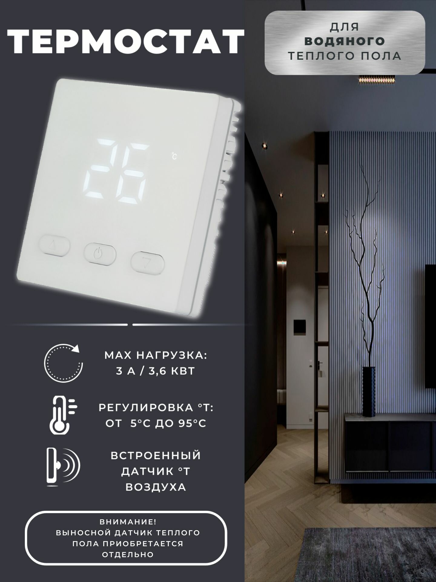 Комнатный термостат предназначен для ручного или автоматического управления температурой воздуха в помещении по встроенному датчику, а также контроля температуры пола по выносному датчику (не входят в ком плект).