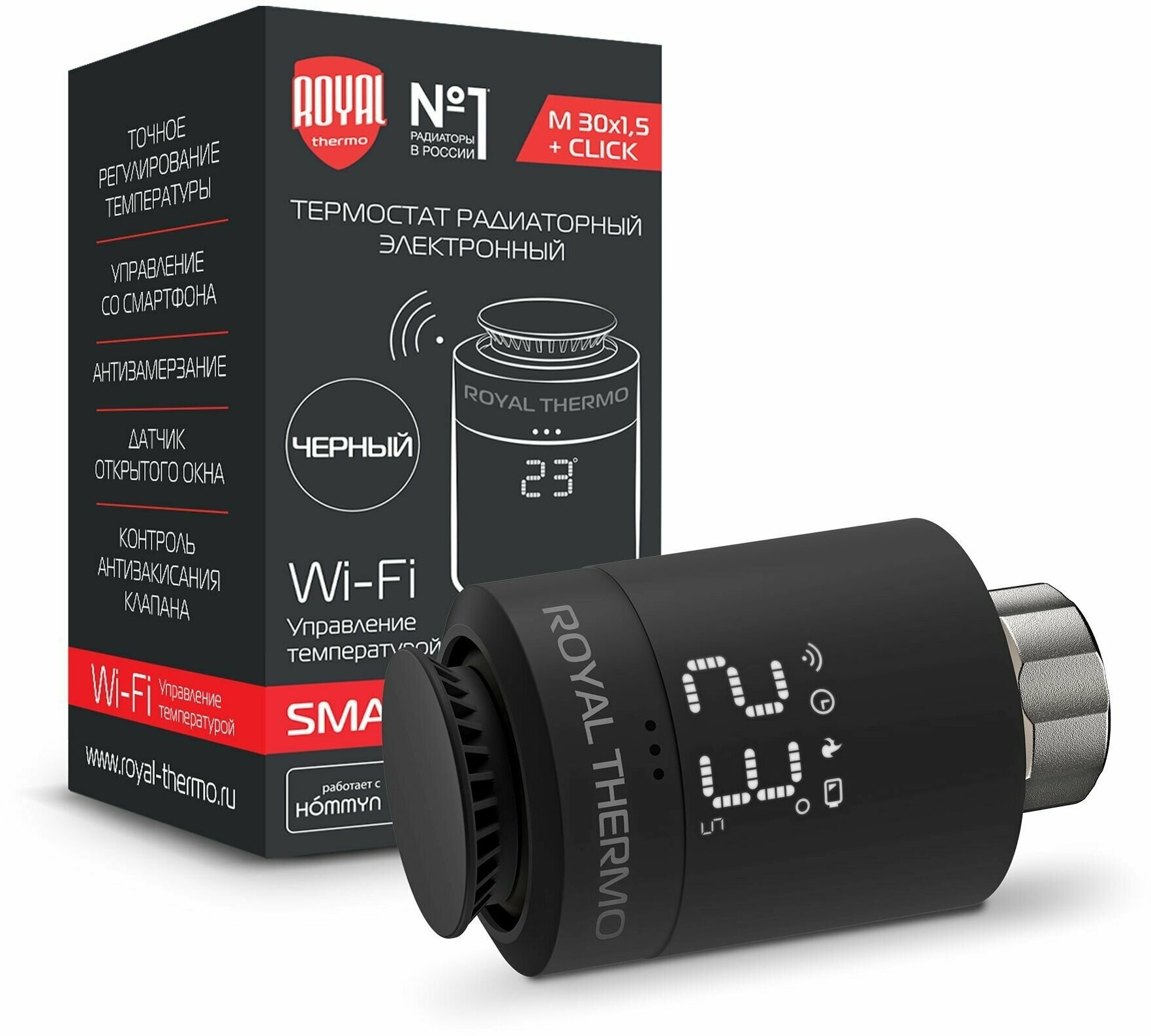 | Дополнительная информация | защита кнопок управления от детей, управление c мобильного приложения по Wi-Fi, тип батареек: 2хAA (LR6/R6), резьба присоединения: М30 х 1,5 + Click"", частота: 2,4Гц, диапазон отображения комнатной температуры: от 0 до +50°С, диапазон беспроводной передачи: 10м, контроль открытого окна, авто включение/отключение |