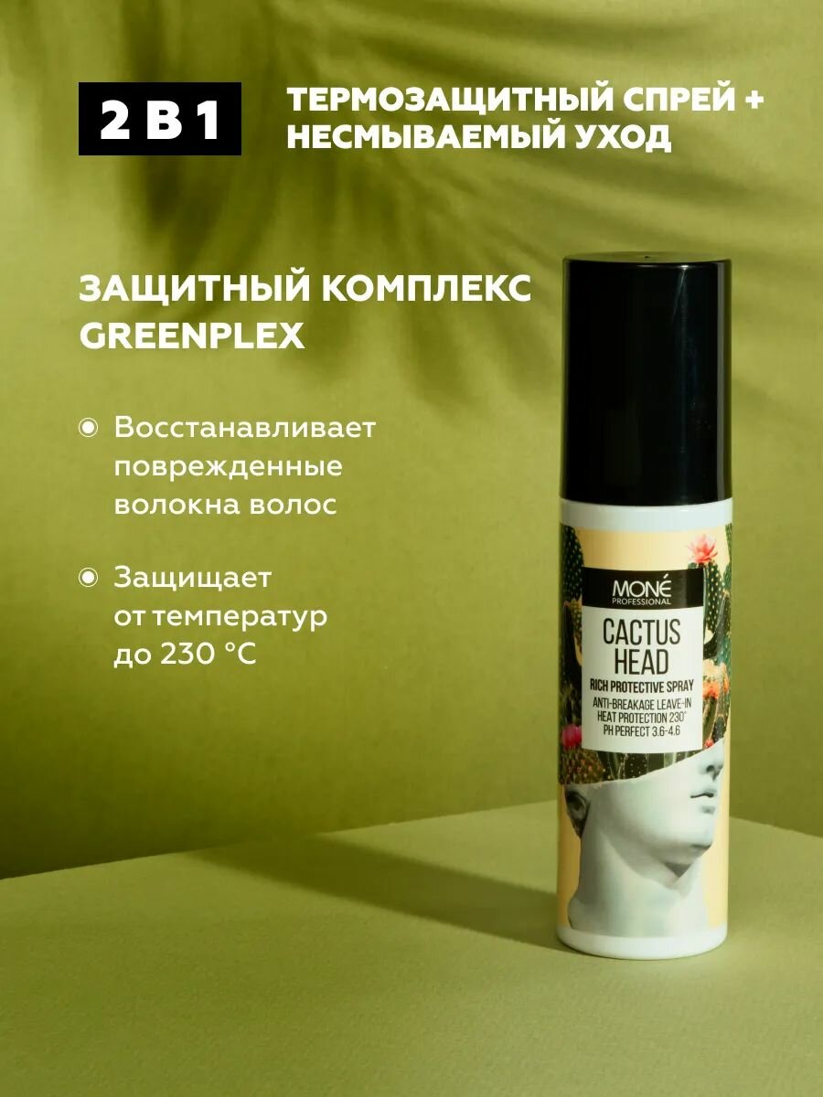 CACTUS HEAD RICH PROTECTIVE SPRAY Спрей термозащита плюс несмываемый уход 2 в 1 для естественных послушных укладок. Защитный комплекс GREENPLEX восстанавливает волокна волос, поврежденные химическими, механическими и термическими воздействиями. Образует невесомую пленку, которая покрывает и защищает поверхность волос от высоких температур до 230°. Термоспрей содержит уникальную светоотражающую молекулу LUMINESCINE для абсолютной гладкости волос. Обладает максимально легкой текстурой, что позволяет комбинировать спрей с другими несмываемыми средствами без эффекта утяжеления. Деликатный pH-сбалансированный состав обладает технологией CUTICLE SMOOTHING TECHNOLOGY, которая заметно выравнивает чешуйки кутикулы, укрепляет и восстанавливает структуру волос и улучшает их здоровье. Ретуширует секущиеся кончики, идеально распутывает и кондиционирует пряди, способствуя легкому расчесыванию локонов.