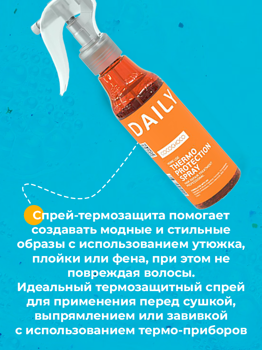 Термозащитный спрей Regular 150 мл от CocoChoco - это профессиональное средство для защиты волос от агрессивного теплового воздействия. Произведенный в Израиле, этот продукт обеспечивает надежную защиту волос при использовании фена, плойки или утюжка до 300 C. Особенностью данного спрея является его невидимая, но эффективная термозащита. Он насыщает волосы кератином и питательными веществами, придавая им гладкость и шелковистость. Поддерживает эффект кератинового восстановления волос, обеспечивая их здоровый вид и блеск. Термозащитный спрей Regular 250 мл подходит для всех типов волос и может использоваться как на коже головы, так и на всей длине волос. Он увлажняет волосы, защищает их от негативного воздействия окружающей среды и придает им блеск. CocoChoco - это израильский бренд, который зарекомендовал себя как производитель качественной косметики для волос. Этот продукт станет отличным подарком для любой женщины, ценящей свои волосы и заботящейся об их здоровье и красоте.