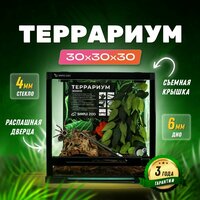 Размер 30х30х30 см подойдет для содержания мелких террариумных животных – пауков, скорпионов, фринов, жуков и др. Причем террариум подходит как для содержания наземных/норных видов, так и для древесников.