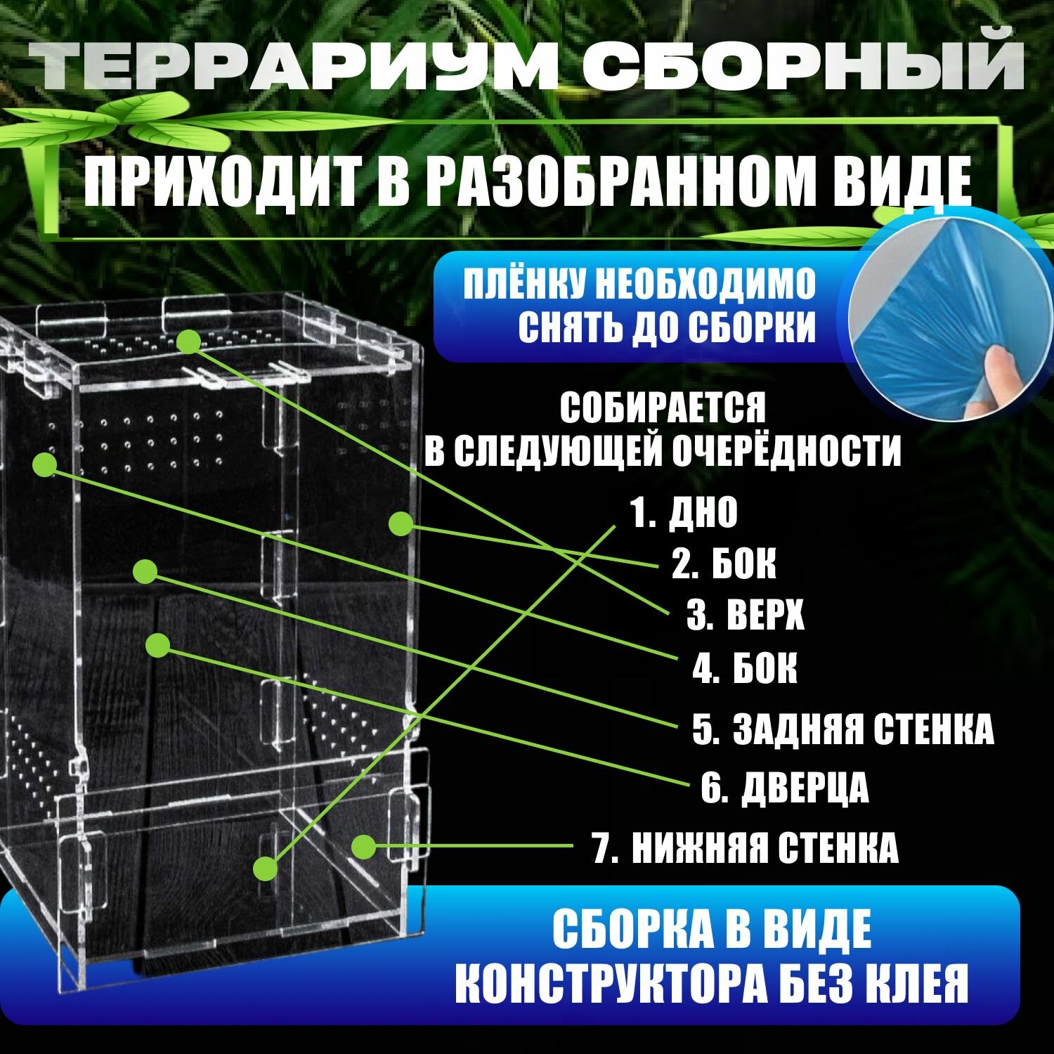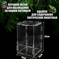 Террариум из высокопрочного органического стекла подходит для содержания экзотических беспозвоночных, земноводных и насекомых. Клетка-террариум производится из высококачественных материалов. Акриловое стекло кристально прозрачное имеет качественную шлифовку кромки и прослужит дольше чем террариум пластиковый. Емкость в основании герметична. Малые габариты стеклянного террариума по внешней кромке 25х15х15 см. позволяют разместить его даже в городской квартире. Откидная дверка удобна в ежедневном кормлении рептилии. Верхняя крышка сетка с отверстиями 2 мм удобна при чистке и кормлении. Над ней можно установить УФ лампу или греющий светильник. Террариум имеет хороший обзор для наблюдения за вашим питомцем. В таком домике прекрасно будут себя чувствовать улитки, гекконы, лягушки, сухопутные черепахи, пауки, ящерицы, змеи, хамелеоны и другие маленькие животные. Мини-контейнер можно использовать для флоры и понравится любителям тропических растений таких как орхидея или суккулентов. Террариум сборный в виде конструктора. Сборка происходит без применения клея. Террариум необходимо располагать так, чтобы он не мешал проходу; место, где он стоит, должно быть достаточно освещенным. Чтобы террариум служил украшением интерьера, необходимо установить на видное место. Существует несколько способов размещения террариумов в комнате. Можно расположить террариум на стене, на окне, рядом с дверями или в других местах вашего жилища. Террариумистика это живой уголок природы и украшение вашего дома или офиса.