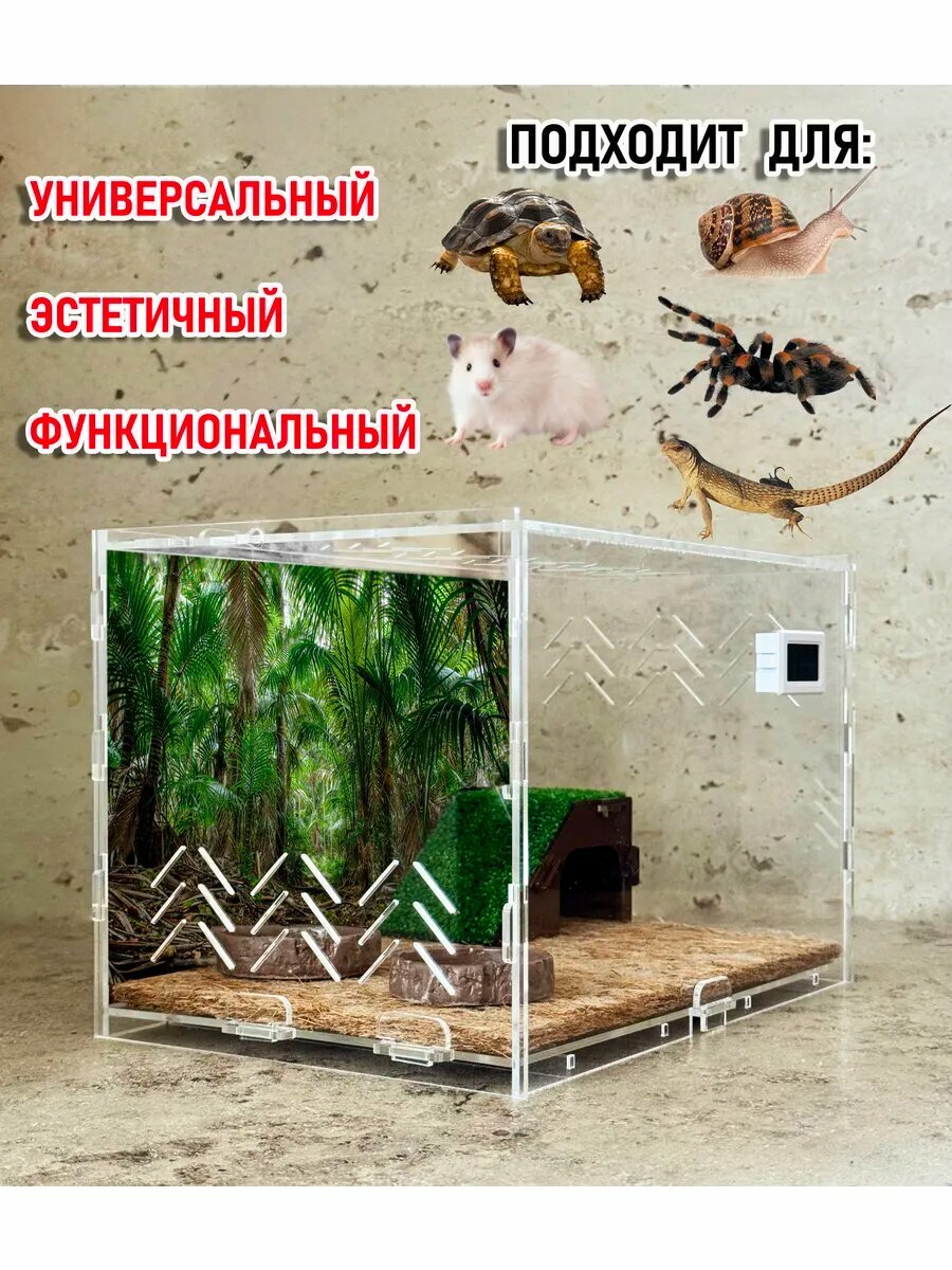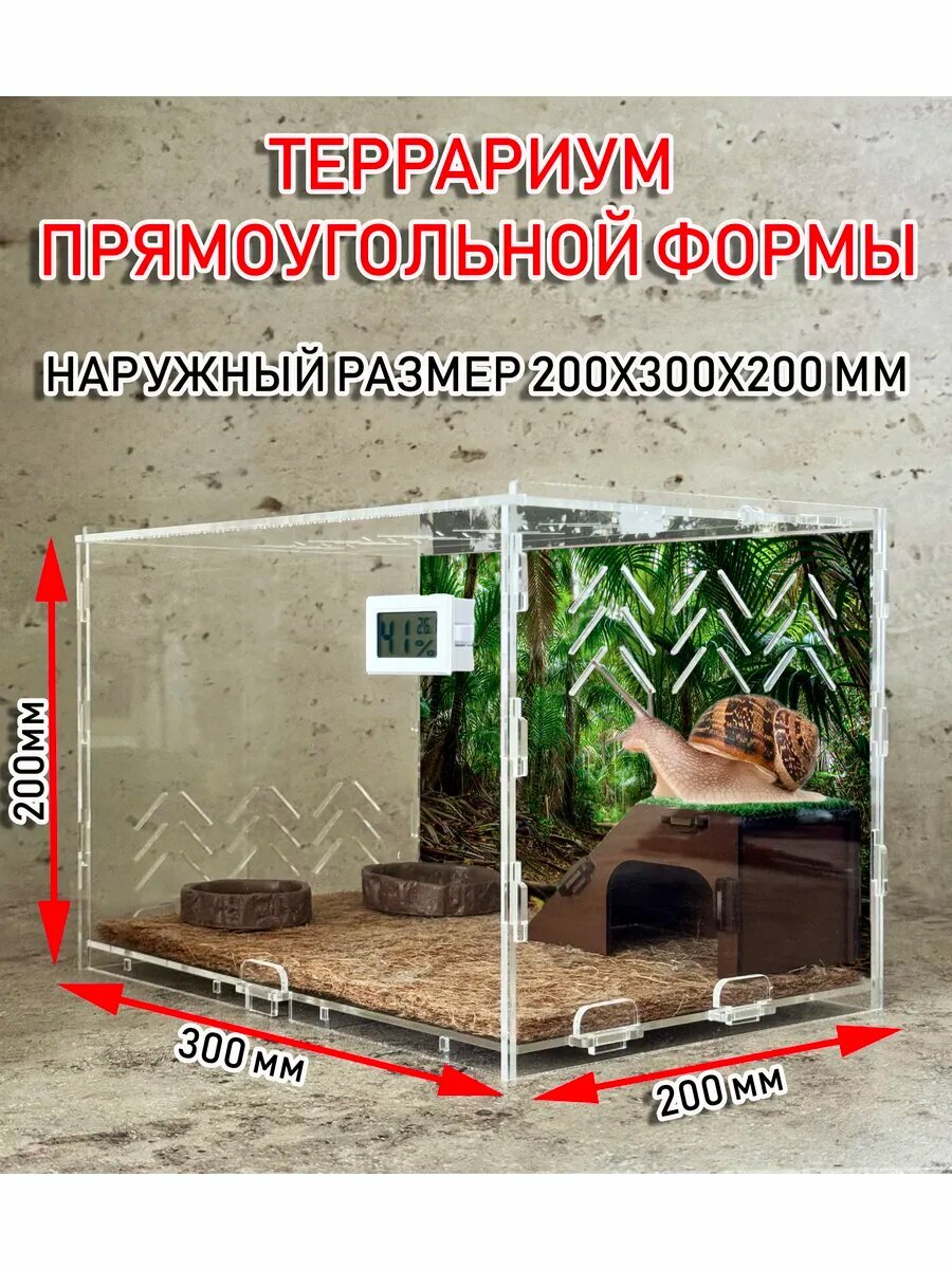 Наш мобильный террариум из акрила выделяется особо прочным акрилом толщиной 3 мм — в 13 раз прочнее обычного стекла. Благодаря кристально прозрачным стенкам вы сможете наблюдать за питомцем в комфортных условиях. В комплекте уже есть встроенный термогигрометр для точного контроля температуры и влажности, и батарейки для него включены. Бокс для экзотических животных с системой вентиляции и механически фиксируемой съемной крышкой легко собирается без клея и быстро разбирается, что делает его идеальным домом для рептилий, пауков, насекомых и других мелких животных. Продуманная вентиляция с отверстиями 1,5 мм обеспечивает свежий воздух и поддержание оптимального микроклимата. Размеры: внешние 200х300х200 мм, внутренние 187х285х189 мм. Полезный объём 10,1 литров. Дно усилено дополнительными пластинами, что гарантирует отсутствие щелей и поддержание нужной влажности. В комплекте — красочный фон (который можно заменить), кокосовый коврик, кормушка, поилка и домик-горка — всё для комфортного содержания. Террариум для рептилий и насекомых идеально подойдет для гекконов, эублефаров, хамелеонов, змей, пауков, богомолов, сухопутных черепах и даже улиток ахатин и виноградных. Также отлично подходит для небольших грызунов (джунгарские хомяки, русские карликовые) и как флорариум для тропических растений. Создайте настоящий живой уголок и идеальный дом для вашего питомца — удобный, практичный и функциональный акриловый террариум, который легко чистить и контролировать.