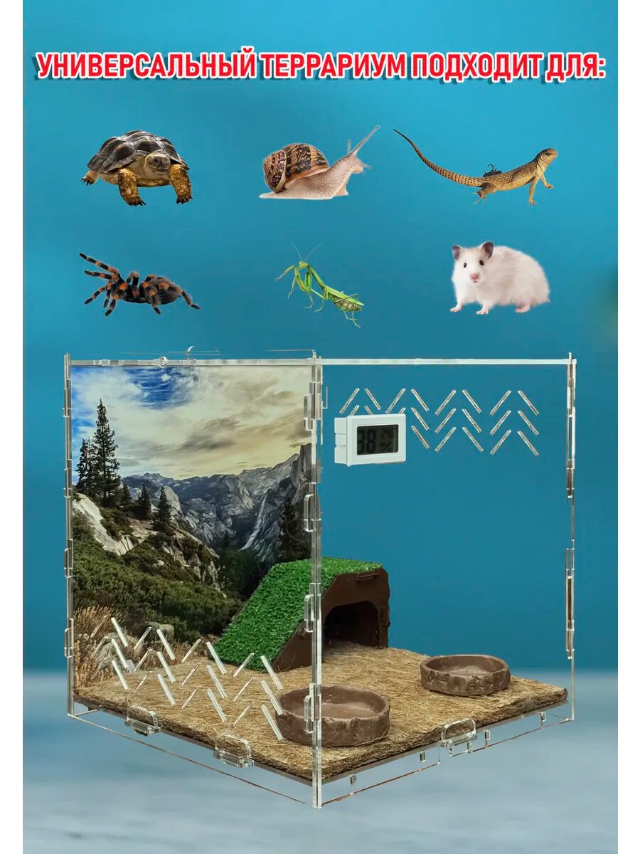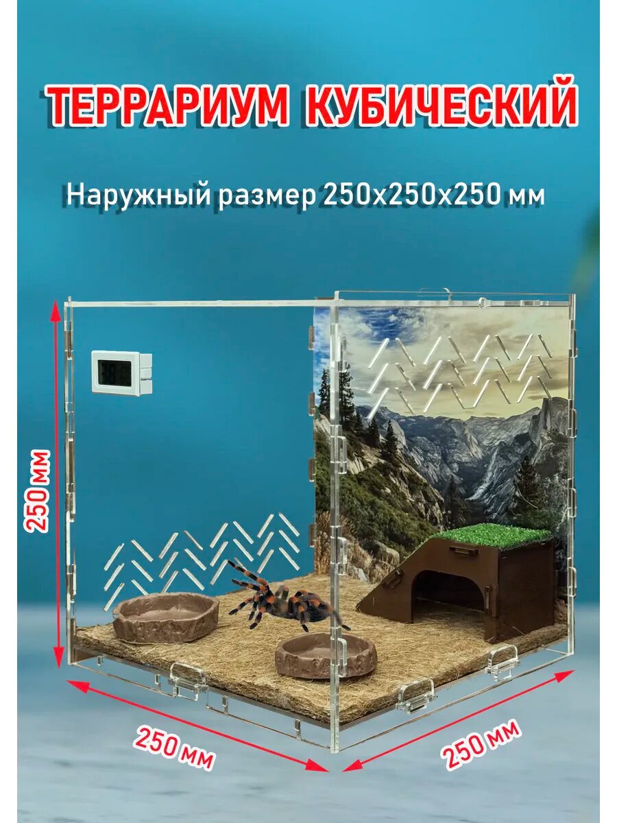 Наш мобильный кубический террариум из акрила 25х25х25 см выделяется особо прочным акрилом толщиной 3 мм — в 13 раз прочнее обычного стекла. Благодаря кристально прозрачным стенкам вы сможете наблюдать за питомцем в комфортных условиях. В комплекте уже есть встроенный термогигрометр для точного контроля температуры и влажности, и батарейки для него включены. Бокс для экзотических животных с системой вентиляции и механически фиксируемой съемной крышкой легко собирается без клея и быстро разбирается, что делает его идеальным домом для рептилий, пауков, насекомых и других мелких животных. Продуманная вентиляция с отверстиями 1,5 мм обеспечивает свежий воздух и поддержание оптимального микроклимата. Размеры и характеристики - Внешние размеры: 250х250х250 мм - Внутренние размеры: 236х237х230 мм - Полезный объем: 12,8 литров - Усиленное дно без щелей для поддержания нужной влажности В комплекте — красочный фон (который можно заменить), кокосовый коврик, кормушка, поилка и домик-горка — всё для комфортного содержания. Террариум куб для рептилий и насекомых Идеально подойдет для гекконов, эублефаров, хамелеонов, змей, пауков, богомолов, сухопутных черепах и даже улиток ахатин и виноградных. Также отлично подходит для небольших грызунов (джунгарские хомяки, русские карликовые) и как флорариум для тропических растений. Создайте настоящий живой уголок и идеальный дом для вашего питомца — удобный, практичный и функциональный акриловый террариум, который легко чистить и контролировать.