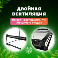 Крышка террариума (она же верхняя вентиляция) представляет собой алюминиевую сетку, на которую можно установить светильники-колпаки с ультрафиолетовыми и греющими лампами, положить светильник Т8, светодиодный светильник или поставить туманогенератор. Кроме того, верхняя крышка съемная, то дает доступ к паучатнику сверху.
