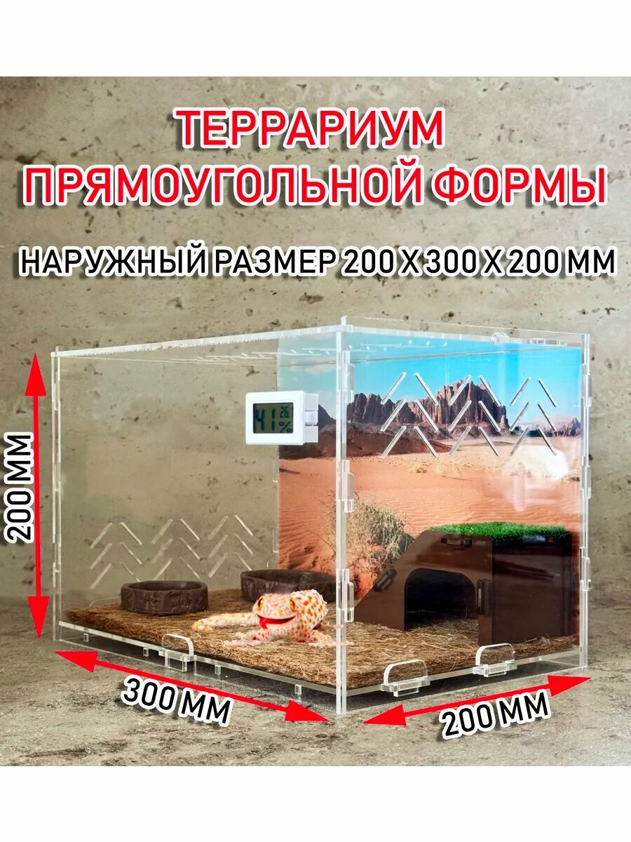 Наш акриловый террариум выделяется своей кристальной прозрачностью и прочным акрилом в 3 мм, что в 13 раз сильнее обычного стекла. Встроенный термогигрометр точно измеряет температуру и влажность, что поможет создать идеальные условия для Вашего питомца, а батарейки уже включены в комплект. С легким по весу, а также сборке и прочным террариумом в комплекте идет красочный фон, который при желании можно заменить на любой другой из нашего ассортимента. Конструкция легко собирается без клея и позволяет разбирать террариум при необходимости. Террариум со съемной крышкой, которая фиксируется механически – достаточно просто выдвинуть её вперед для доступа. А продуманная система вентиляции со специальными отверстиями шириной 1,5 мм обеспечивает идеальный микроклимат внутри. Размеры: внешние 200х300х200 мм, внутренние 187х285х189 мм. Полезный объём 10,1 литров. Дно усилено дополнительными пластинами, что гарантирует отсутствие щелей и поддержание нужной влажности. Мы позаботились о базовом оснащении. В комплекте вы найдете всё необходимое: уютный кокосовый коврик, кормушку, поилку, домик-горку. Наш террариум станет идеальным домом для самых разных питомцев: для пауков; богомолов; молодых ящериц - эублефар, геккон, хамелеон; сухопутных черепах, улиток – ахатины, виноградные улитки, архахатина, небольших хомяков - джунгарские, русские карликовые. А еще он отлично подойдет для выращивания тропических растений. Представьте: ваш питомец живет в комфортных условиях, а вы с удовольствием наблюдаете за ним через прозрачные стенки. При этом все параметры под контролем, а уход за террариумом не доставляет никаких хлопот. Именно такой баланс удобства и функциональности мы и стремились создать!