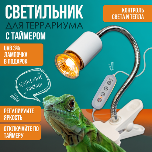 ампа для террариума на гнущейся ножке с таймером и лампочкой UVA и UVB в подарок – это идеальный светильник для тех, кто заботится о своих питомцах. Уф лампа предназначена для рептилий, черепах, в том числе красноухих, гекконов, змей, улиток, мелких животных, особенно грызунов и хомяков. Светильник имеет крепление прищепку и гнущуюся ножку, что позволяет удобно расположить его в любом положении. Он подойдет террариума, акватеррариума и обеспечит достаточное освещение для рыб в аквариуме. Также ее можно испоьзовать для обогрева и освещения клеток птиц, в том числе попугаев. Диммируемая лампа позволит вам регулировать яркость света. Диммер расположен на самом проводе лампы и позволяет плавно включать и выключать свет, не пугая и не перегревая животное. Это греющая лампа, которая создает тепловые условия, необходимые для нормального функционирования многих рептилий, способствует выработке витамина Д, росту и размножению. Она заменяет солнце и обеспечивает не только свет, но и необходимый диапазон температур. Лампа для террариума – это идеальный аксессуар для тех, кто увлекается ящерицами, гекконами, лягушками и другими видами рептилий. Таймер позволяет выставить необходимый промежуток времени работы, по его заврешении светильник отклчается автоматически. Этот зоотовар подойдет также и для насекомых, которые тоже нуждаются в определенной освещенности и температуре. Ультрафиолетовая лампочка в подарок – это отличный выбор для тех, кто хочет сделать своим питомцам комфортную жизнь в террариуме. Независимо от того, какую лампочку вы выберете – светодиодную, накаливания, галогенную или ультрафиолетовую, светильник будет отлично выполнять свои функции. Лампа для террариума создана специально для сухопутных и водных черепах и других видов рептилий. Она греет, создает необходимый климат и регулирует температуру. Если вы ищете высококачественный светильник для террариума, то лампа для террариума на гнущейся ножке с лампочкой – это необходимый товар для комфортного пребывания животного в его домике. Размер: 11,5 - 7,5 - 29,5 см. Размер прищепки: 11,5- 7,5см. Длина шнура питания - 110 см. Цоколь - Е27. Патрон керамический, галогенная (накаливания) лампа диммируемая, другими словами светильник имеет регулировку интенсивности света и тепла. Лампочка галогенная с UVA (97%) и UVB (3%), то есть уф лучами (ультрафиолет). Будьте внимательны! Светильник может нагреваться при включении его с лампочкой, которая идет в подарок, что абсолютно нормально для лампочек накаливания. Это не брак!