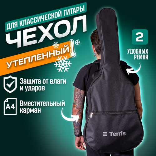 Утепленный чехол для классической гитары TERRIS TGB-C-05 BK изготовлен из плотной синтетической ткани. Специальная конструкция этой ткани обеспечивает прочность, износостойкость изделию и придает ему водоотталкивающее свойство.