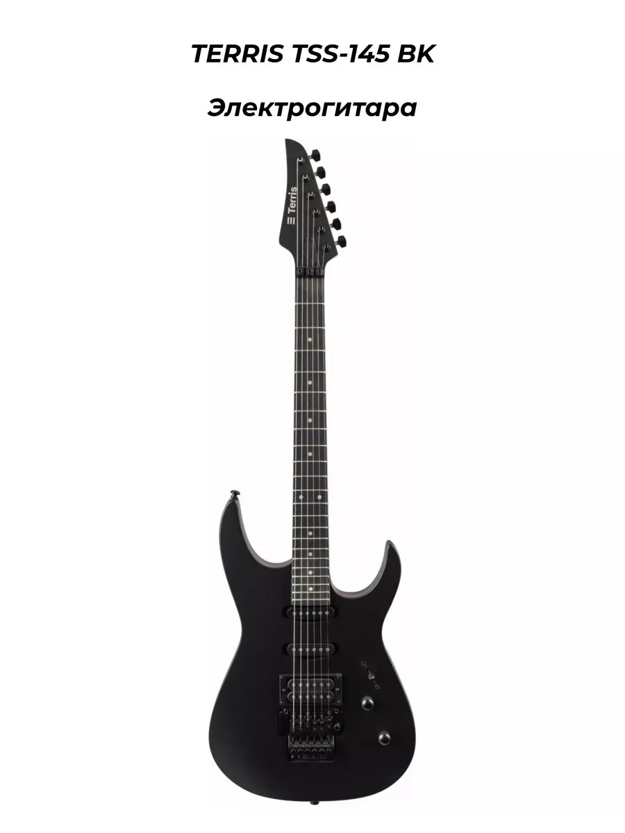 TERRIS TSS-145 BK - Электрогитара. Terris представляет обновленную линейку бюджетных электрогитар. Более высокое качество ЛКП. Дополнительный контроль качества и отстройка инструментов с завода. Электрогитара сделана в стиле SuperStrat. Корпус гитары сделан из тополя, что обеспечивает стабильность инструмента. Гриф из клена и накладка из техновуда обеспечивают комфортную игру на электрогитаре в течение долгого времени. Конфигурация звукоснимателей H-S-S(ceramic). Популярная конфигурация звукоснимателей с пятипозиционным переключателем для широкого диапазона звучания, подходящего практически для любого музыкального стиля. Электроника: 1 регулятор громкости и 1 тона. Бридж: Floyd Rose. Лады: 22 шт, 2.7. Мензура: 648 mm/25.5". Анкер двойного действия. Колковая механика черного цвета. Колки расположены в один ряд. Цвет: матовый черный. Дополнительная Информация Звукосниматели: HSS Количество ладов, шт: 22 Количество струн: 6 Материал грифа: клен Материал корпуса: тополь Материал накладки грифа: техновуд Мензура, мм: 648 мм Регулировки звука: 1V 2T Страна происхождения: китай Тип бриджа: Floyd-Rose Тип корпуса: Superstrat Цвет: черный