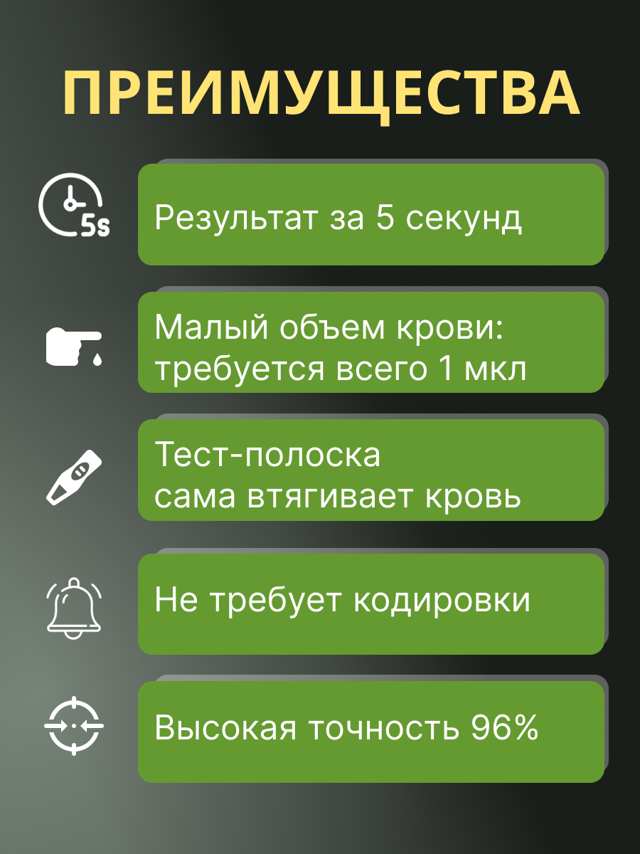 Тест-полоски содержат глюкозодегидрогеназу – фермент, который препятствует тому, чтобы кислород повлиял на результат анализа.