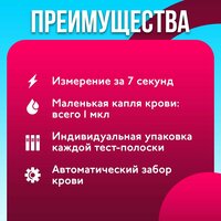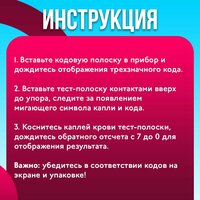 | Дополнительная информация | для тестирования подходит только свежая капиллярная кровь; проверьте, не истек ли срок годности тестовых полосок; надорвите край блистера тестовой полосы и оторвите часть в области контактов; держась за оставшуюся часть упаковки и не касаясь пальцами самой полоски, установите тестовую полоску в глюкометр; отделите одну индивидуально упакованную тест-полоску «Сателлит Экспресс»; вставьте тест- полоску контактами вверх до упора в разъем глюкометра; снимите оставшуюся часть упаковки; на экране появится трехзначный код; убедитесь, что код совпадает с номером серии на упаковке тест-полосок; мигающий символ капли означает, что глюкометр готов к тестированию; проколите подушечку пальца автоматической ручкой для прокалывания и дождитесь появления капли крови; после получения капли крови незамедлительно прикоснитесь к ней краем тест-полоски; тест-полоска сама втянет необходимое количество крови; удерживайте край тест-полоски в капле крови до тех пор, пока символ капли не прекратит мигать; глюкометр начнет отсчет времени от 7 до 0, после чего на экране появится показание глюкозы в крови; извлеките использованную тест-полоску из разъёма глюкометра; тестирование уровня глюкозы в крови завершено; извлеките и утилизируйте использованную тест-полоску |