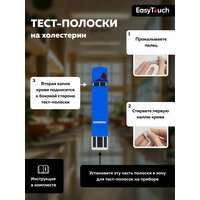 Система мониторинга EasyTouch® по измерению уровня холестерина в крови предназначена для количественного измерения уровня холестерина в свежей капиллярной цельной крови. Это измерение основано на определении текущего изменения, которое вызвано реакцией взаимодействия холестерина с реагентом на электроде тест-полоски. Когда образец крови легко соприкасается с контрольным полем полоски, кровь автоматически втягивается в реагентную зону анализа. Результат теста будет отображен на экране прибора спустя 150 секунд. Диапазон измерения системы мониторинга EasyTouch® по измерению уровня холестерина в крови лежит в пределах от 2.6 до 10.4ммоль/л. (100 до 400 мг/дл). Тест-полоски EasyTouch® на холестерин предназначены для использования только с образцом свежей капиллярной цельной крови. Храните тест-полоски при температуре от 4 градусов С до 30 градусов С. Не замораживать. Не используйте тест-полоски, если у Вас мокрые или грязные руки. Критически больных пациентов не следует тестировать системой для мониторинга холестерина в домашних условиях. Ни в коем случае не режьте, не сгибайте, не царапайте тестполоски. Выбрасывайте каждую тест-полоску после одноразового использования. Не используйте тест-полоски после истечения срока годности. Капля крови наносится с боковых торцов тест-полоски. Для измерения требуется 15 мкл крови, результат измерения холестерина будет показан на экране прибора через 150 секунд Для использования требуется прибор Изи Тач