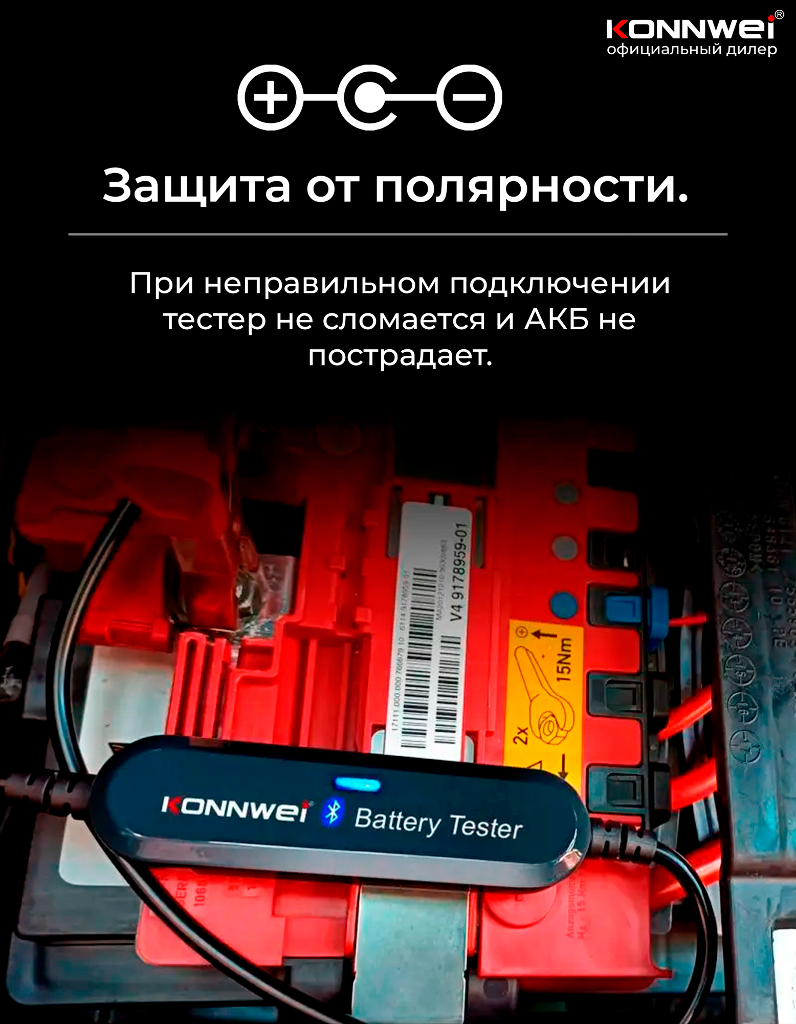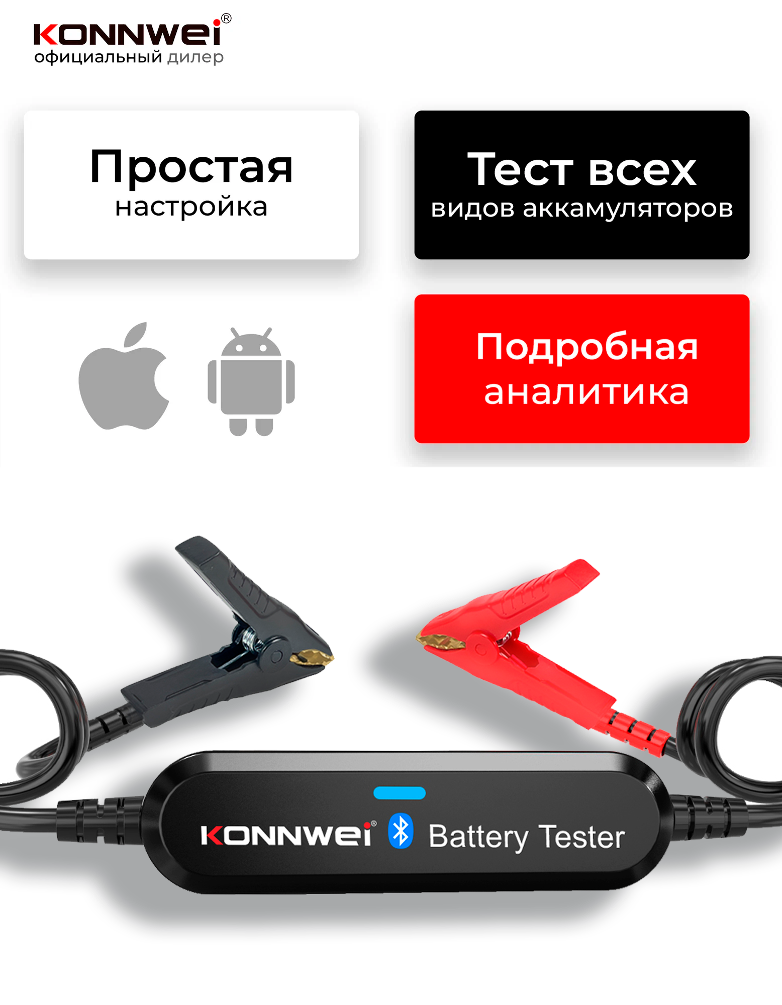 Купить Тестер аккумулятора KONNWEI BK100 Bluetooth 5.0 — анализатор АКБ, проверка пуска и зарядки, iOS/Android с доставкой по всей России.