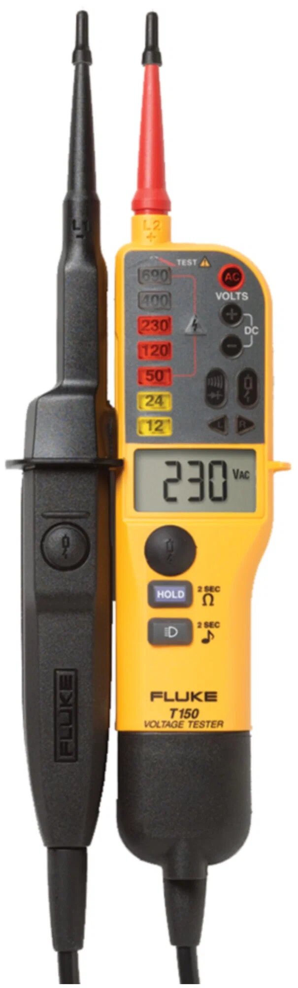 Назначение тестера напряжения/целостности с ЖК-дисплеем, омметром и переключаемой нагрузкой Fluke T150: Тестер напряжения/целостности с ЖК-дисплеем, омметром и переключаемой нагрузкой Fluke T150 — прочный высококачественный тестер для получения быстрых результатов нужными вам способами. Новый двухполюсный тестер Fluke T150 превосходит все предыдущие модели по прочности конструкции и легкости использования. Теперь возможно получение результатов измерений быстро и в нужной форме благодаря большим и удобным кнопкам, яркому экрану с подсветкой и хорошо различимым звуковым и механическим сигналам, предназначенным для использования в самых разных условиях. Особенности тестера напряжения/целостности с ЖК-дисплеем, омметром и переключаемой нагрузкой Fluke T150: Степень защиты CAT IV 600 В, CAT III 690 В, двухполюсные тестеры Fluke соответствуют требованиям новейшего европейского стандарта безопасности EN 61243-3: 2010, действующего для испытательного оборудования данного типа; 4 способа определения напряжения переменного/постоянного тока: двухполюсные тестеры компании Fluke делают показания легко читаемыми, отображая значения напряжения четырьмя способами: четко видимая полоска светодиодных индикаторов, яркий цифровой дисплей с показаниями измеряемого значения, проверка целостности проводника со звуковой индикацией и вибрацией для тактильного оповещения. Выбор способа индикации осуществляется пользователем; Градуированная шкала с подсветкой, а также индикаторы с подсветкой: яркая подсветка гарантирует видимость кнопок и индикаторов в любых условиях освещения; Тактильное оповещение с помощью вибрации: даже если дисплей не виден, а звуковой сигнал не слышен, вы всегда узнаете о присутствии напряжения. Эта функция особенно полезна при работе в условиях шума или в том случае, если нельзя отводить взгляд от щупов; Возможность включения/выключения звука для проведения испытаний в помещениях, где требуется соблюдение тишины: если работа ведется в помещении, где требуется соблюдение тишины, например в медицинском учреждении или в офисе, звук прибора может быть отключен; Индикатор уровня заряда батарей; Определение напряжения даже при разряженных батареях; Улучшенная фиксация щупов для надежного хранения; Индикатор чередования фаз для трехфазных систем: в случае питания двигателей, приводов и электросистем трехфазным источником электроэнергии воспользуйтесь инновационной системой быстрого определения чередования фаз для трехфазных источников; Функции тестирования УЗО: удобная двухкнопочная схема проверки позволяет увеличить ток через проверяемое устройство и удаленно активировать устройства защитного отключения (УЗО), чтобы проверить их корректное подключение. К прибору прилагается краткое руководство по основным методам тестирования УЗО; Встроенный электрический фонарик: при проведении измерений в темноте имеется возможность подсветки кнопок с помощью фонарика, что позволяет проводить измерения быстрее и надежнее; Функция однофазной проверки напряжения: позволяет быстро определить, какие из проводников находятся под напряжением; Защита наконечника щупа имеет возможность адаптации под изменяющиеся условия: защитные насадки наконечников щупов уменьшают размер открытой металлической части с 19 мм до 4 мм, что снижает риск случайно