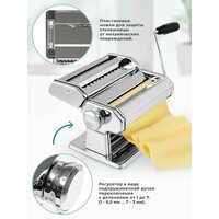 Тестораскатка лапшерезка ручная Gemlux GL-PMF-180 – незаменимый помощник хозяйки. Это металлическая кухонная утварь, приспособление для раскатки крутого теста в пласт при изготовлении пасты: лазаньи, канеллони, равиоли. Аппарат также можно использовать как раскатку теста для чебуреков, для раскатывания теста при лепке пельменей, резки домашней лапши, лапши для лагмана и других макаронных изделий. Механическая раскаточная машинка оснащена 1 парой валков, которые приводятся во вращение вручную при помощи съемной рукоятки. Ширина раскатки 18 см, толщина пласта регулируется в пределах от 0,5 до 3 мм (7 положений). Для регулировки зазора между валками оттяните ручку регулятора в сторону (не перекашивая ее!), поверните в нужном направлении и верните на место так, чтобы зубец на ручке вошел в предназначенный для него паз. В комплект тестораскатывающей машины входит съемная двусторонняя насадка лапшерезка для нарезки плоской лапши тальолини шириной 2 мм и феттучине шириной 6,25 мм. Для крепления к поверхности стола, чтобы зафиксировать тесто раскатыватель в процессе работы, предусмотрена струбцина. Машина для приготовления лапши выполнена из хромированной стали. Обратите внимание! Прибор нельзя мыть водой и в посудомоечной машине. Очищайте его от муки и остатков теста сухой щеткой. Тестораскатыватель предназначен для раскатки очень крутого теста! Лучше всего он работает с таким рецептом: на 200 г муки - 2 яйца, 1 ст. л. растительного масла и 1/2 ч. л. соли. После замеса такое тесто выглядит как смесь сухих комочков. Слепите его в шар, дайте отлежаться и нарежьте на небольшие куски. Чтобы машинка не рвала тесто, необходимо начинать с самого большого зазора между валками. Пропустите кусок между валками, присыпьте мукой, сложите пополам, поверните на 90о и снова пропустите. Повторите несколько раз. Уменьшите зазор на единицу и повторите процедуру. Постепенно тесто будет становиться более тонким, гладким и пластичным. Не забывайте присыпать мукой, чтобы лапша не слипалась.