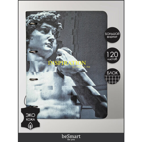 Коллекция "Inspiration" от Be Smart отражает поиск вдохновения в великом и вечном, в сплетении времени и моды. Долгий творческий процесс, в итоге которого рождается блестящая идея. Именно так создаётся искусство. Вдохновляйся нашей тетрадью А4 формата (240х310 мм), которая идеально подойдет для больших записей и долго не закончится! Крепление на кольцах позволит тебе не только легко убирать ненужные листы и добавлять новые, но и вставлять дополнительные блоки. Можно даже вести несколько предметов в одной тетради. Гибкая обложка из искусственной кожи с цветной печатью снаружи и плотным черным дизайнерским картоном внутри имеет скругленные уголки, которые позволяют не порвать подкладку сумки. Сменный внутренний блок в клетку с прямыми уголками на 120 листов (240 страниц) из высококачественной белой бумаги плотностью 65г/м2.
